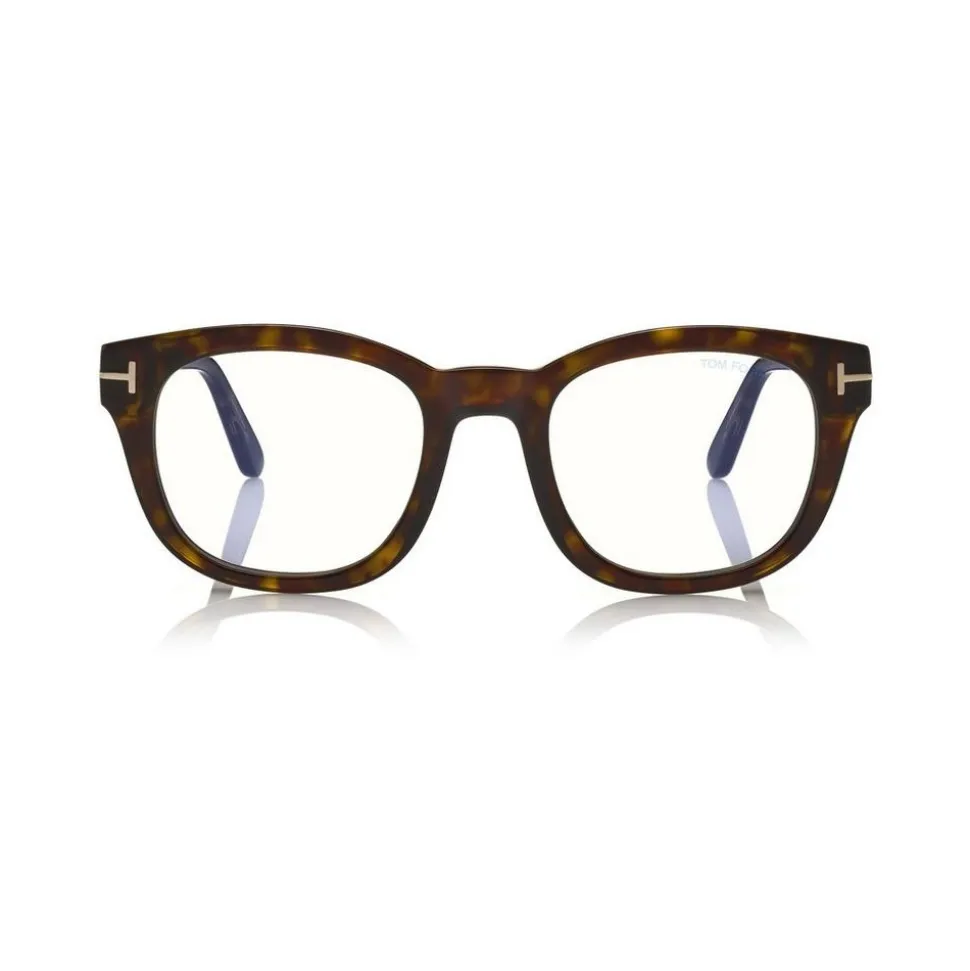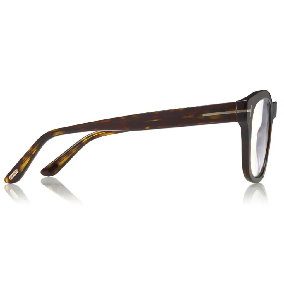Discover the latest ready-to-wear clear lenses now available in TOM FORD Eyewear. These protective lenses reduce risks of blue lights and increase visual comfort from long exposure to digital devices. Soft squared acetate style with metal ‘T’ temple decoration.