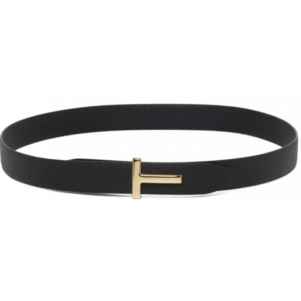 Tom Ford Brown and Black Belt. Brown and black grained calfskin belt, golden brass T monogram, adjustable closure.