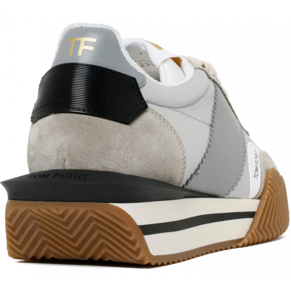 Tom Ford James Chunky Platform Sneakers. Silver tone and taupe brown calf leather sneakers, suede panels, micro mesh panels. Logo patch at the tongue, logo print to the side, contrasting branded heel counter. Front lace up fastening, almond toe, branded insole, platform wedge and chunky rubber sole.