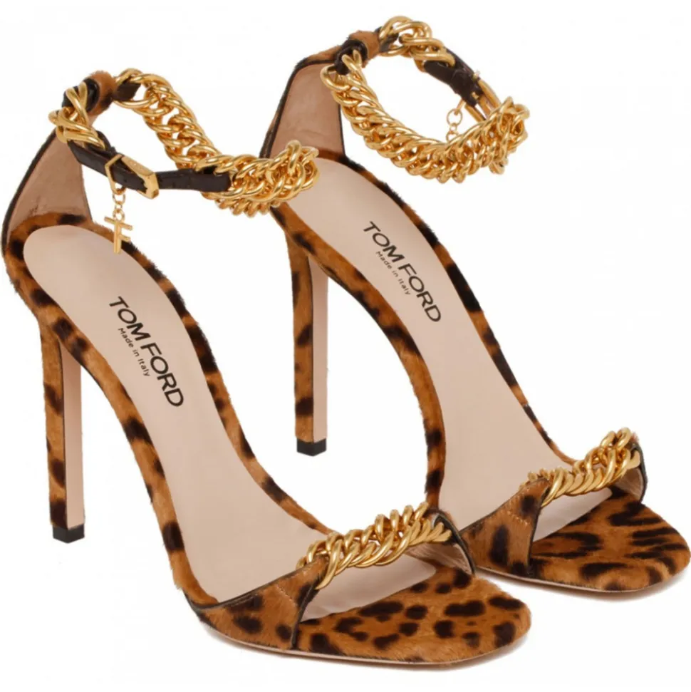 Tom Ford Leopard Print Sandal. Leopard print calf hair and leather zenith sandal, square toe shape, 10,5 cm Stiletto heel. Gourmette chain detail, TF charm, buckle fastening ankle strap.
