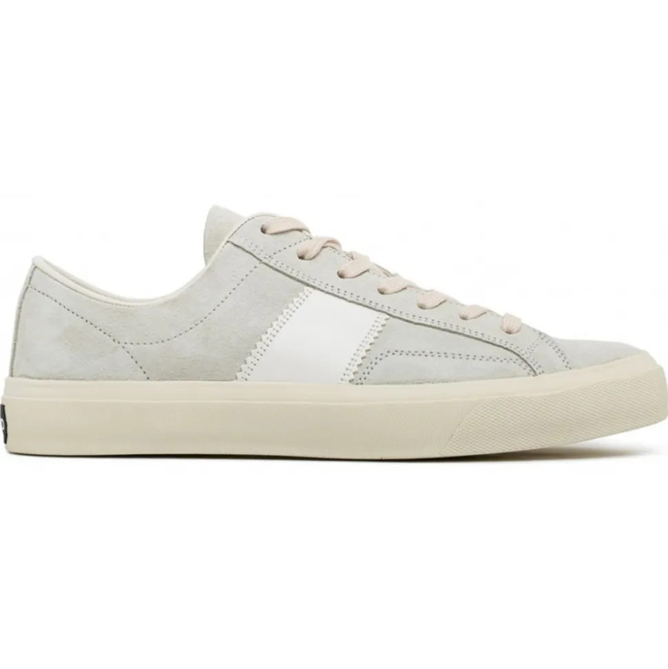 Tom Ford Marble and Cream Calf Suede and Calf Leather Logo Patch Sneakers. Marble and cream calf suede and calf leather lace up sneakers, multi panel design, front lace up fastening. Round toe, branded heel counter, flat rubber sole.