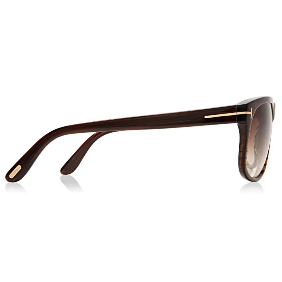 Shiny striped brown acetate frame with rose gold metal ‘T’ logo and gradient brown lenses