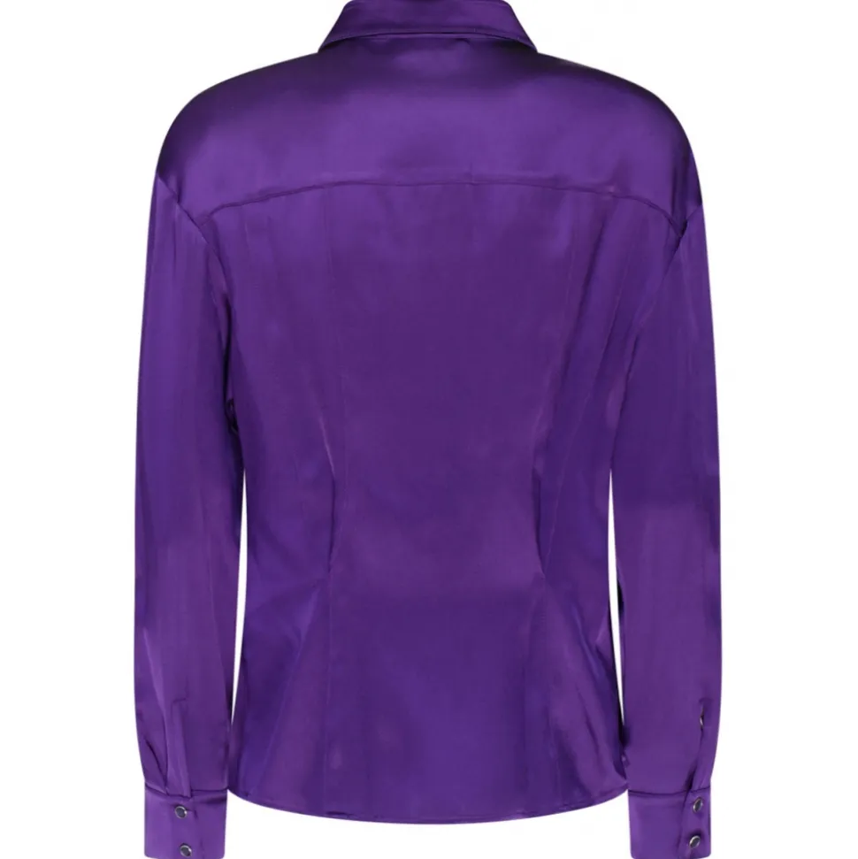 Tom Ford Purple Satin Western Style Shirt. Purple satin shirt, Western style, classic collar. Front press stud fastening, two chest flap pockets, long sleeves, buttoned cuffs and straight hem.