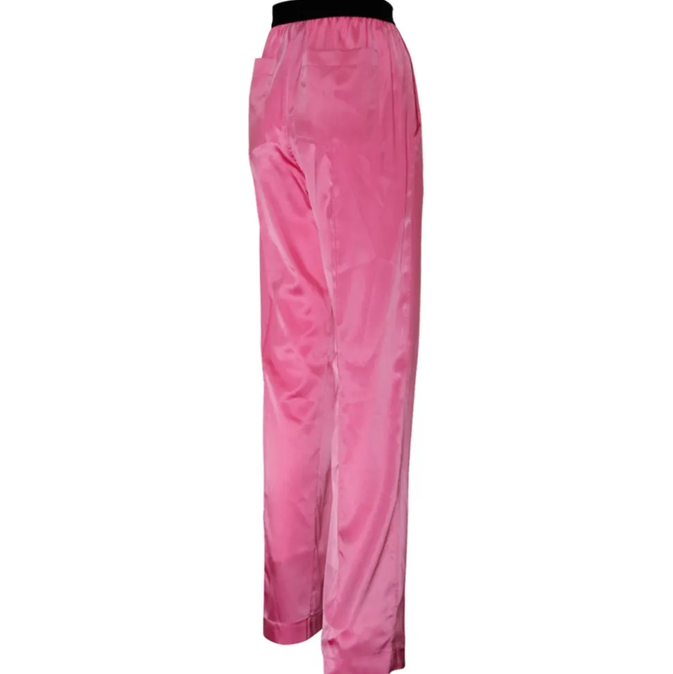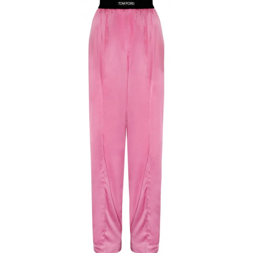 Tom Ford Rose Bloom Stretch Silk Satin PJ Pants. Rose bloom silk pj pants, black elasticated waistband, jacquard logo label on the waistband, front slanted pocket, front stitched pleat, back patch pockets.