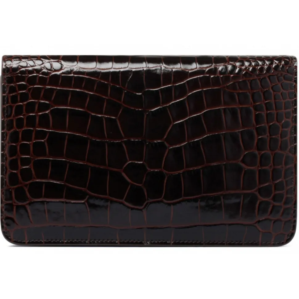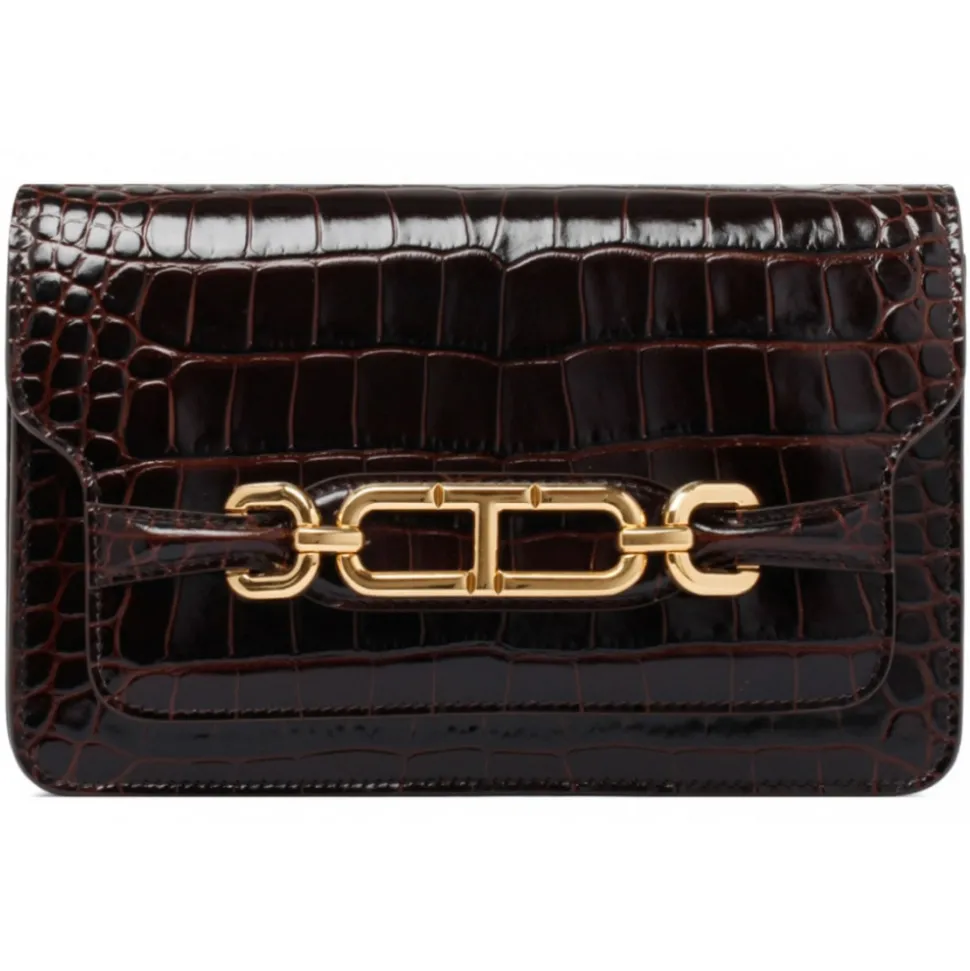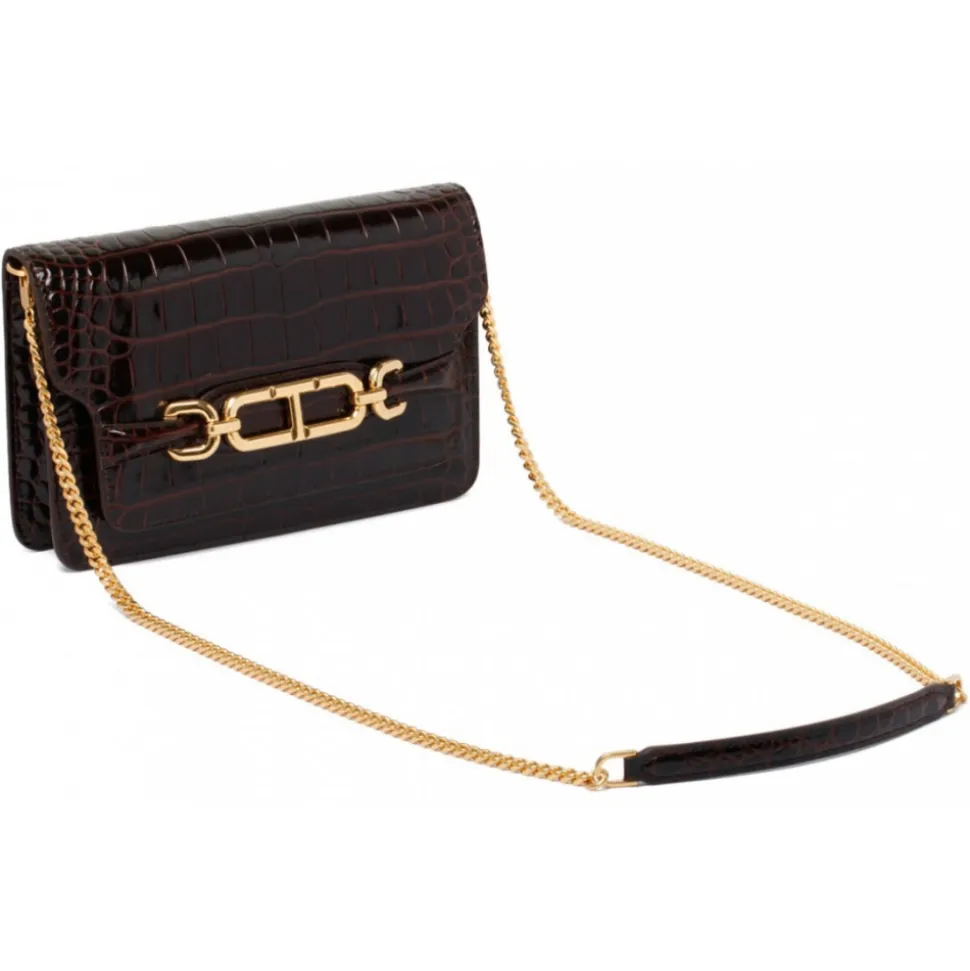 Tom Ford Small Whitney Shoulder Bag. Brown stamped crocodile leather small shoulder bag, front flap decorated with metal Whitney T shaped signature. Detachable and adjustable chain shoulder strap with leather pad, hand, shoulder and crossbody carry. Magnetic closure, one compartment, one inner open pocket.