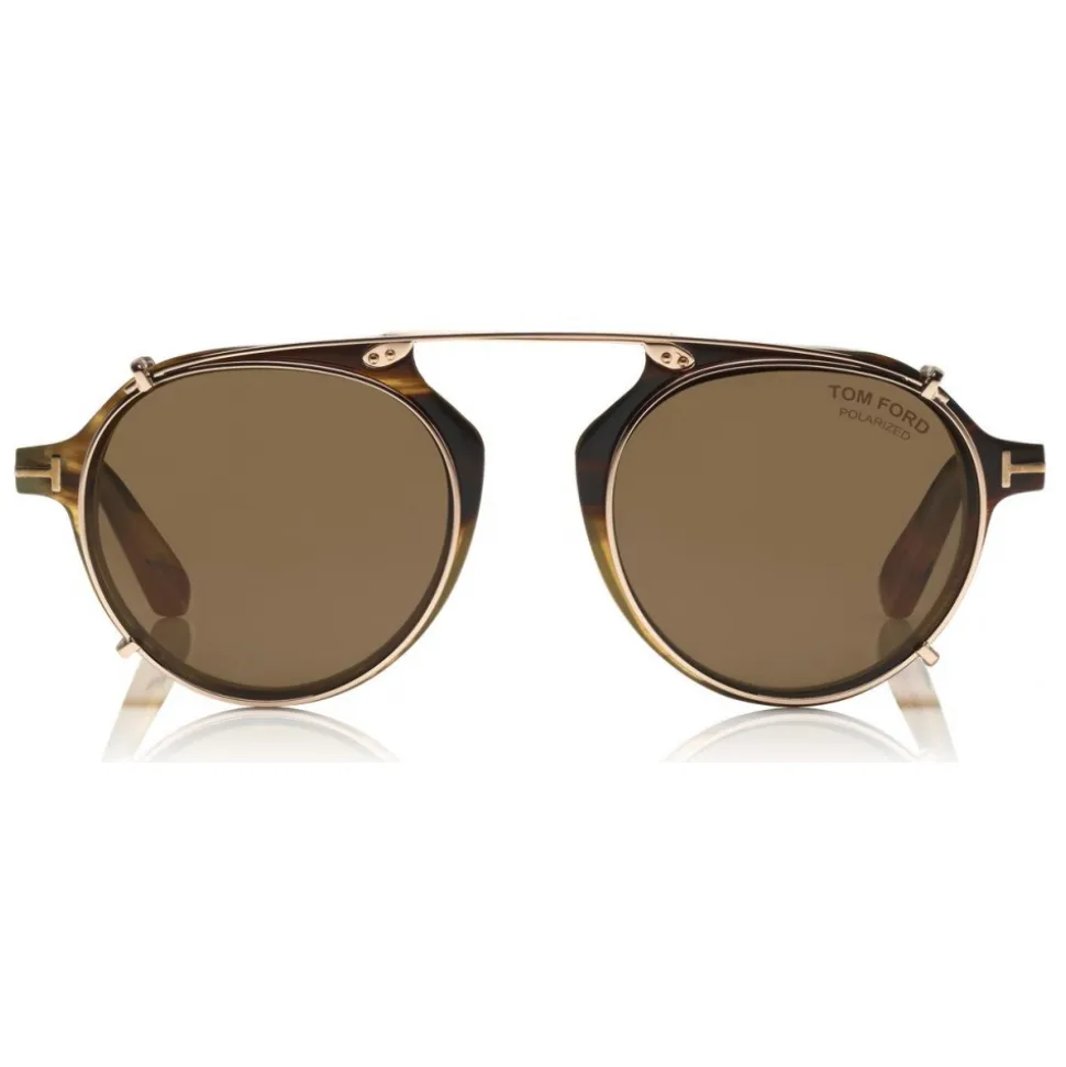 “The Tom Ford Private Collection is an exclusive edition of sunglasses and optical frames based on the eyewear that Mr. Ford wears every day. Discover the latest ready-to-wear clear lenses now available in TOM FORD Eyewear. These protective lenses reduce risks of blue lights and increase visual comfort from long exposure to digital devices. Soft pilot in real buffalo horn shape, with metal bridge. Real water buffalo horn is selected for its luxurious finish and natural pattern that gives each piece its unique quality. It is offered with polarized clip on.”