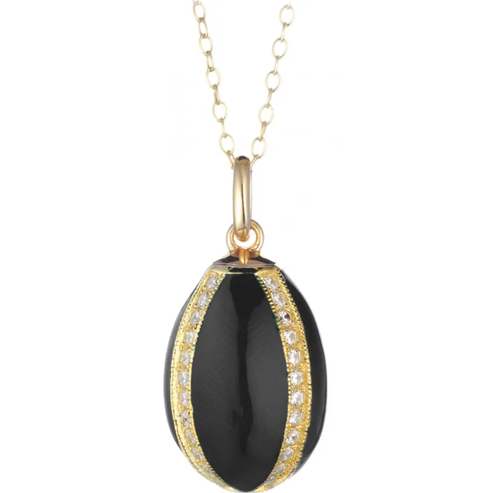 Necklace in 925 gilded silver with egg-shaped pendant with guilloché work and finished with black enamel, decorated with four symmetrical silver bands studded with zircons, creating four sections.