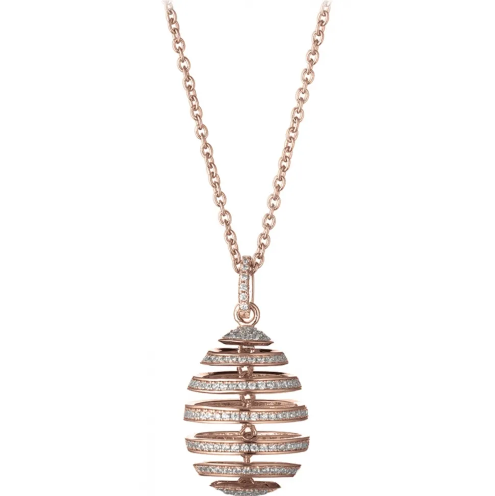 925 pink silver necklace with pendant in the shape of an abstract egg with white zircons. The egg is represented as a sinuous mobile spiral, with parallel concentric segments.