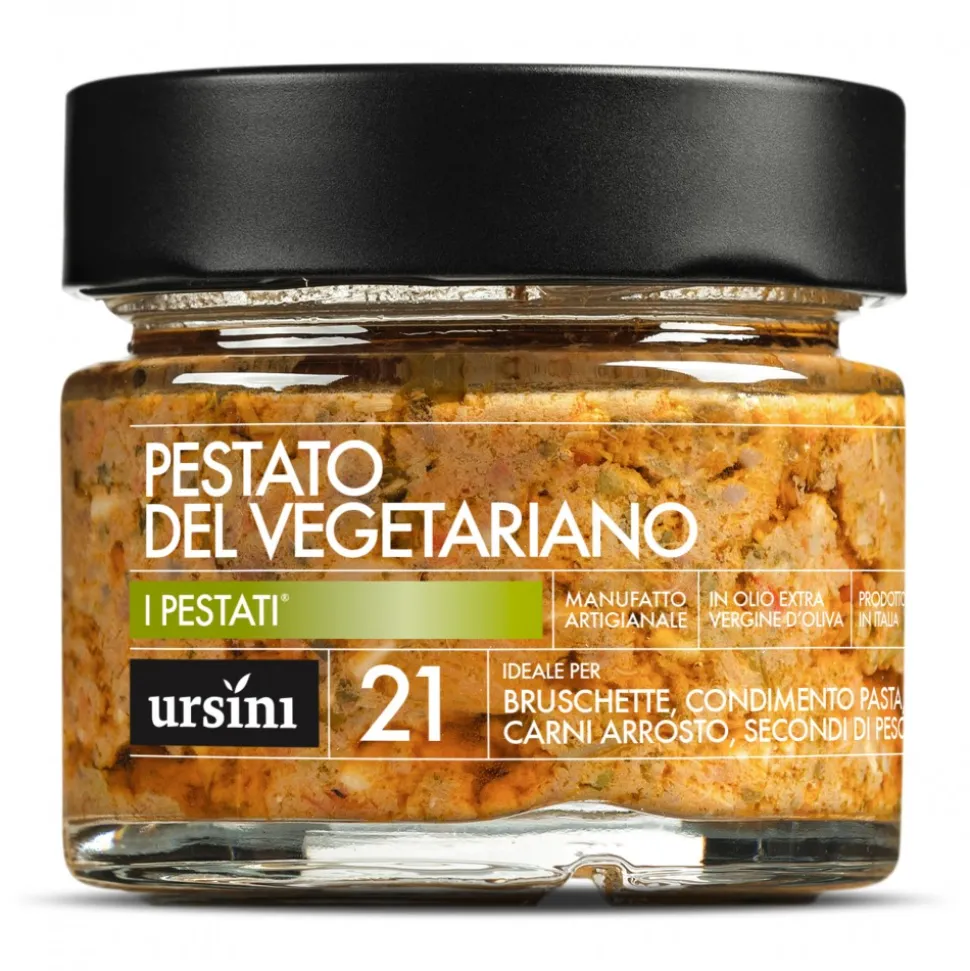 The Ursini “Pestati” are artisanal products which are totally natural. A high quality line, offered in 145 grams glass jar, perfect for any need consumer and to be enjoyed until the end. Even though pasteurised by bain‐marie, each Pestato has 30-month shelflife from the production, according to the ingredients and method of preservation. Once opened it, if there anything left, we recommend to cover it with a good quality extra virgin olive oil and to refrigerate it.