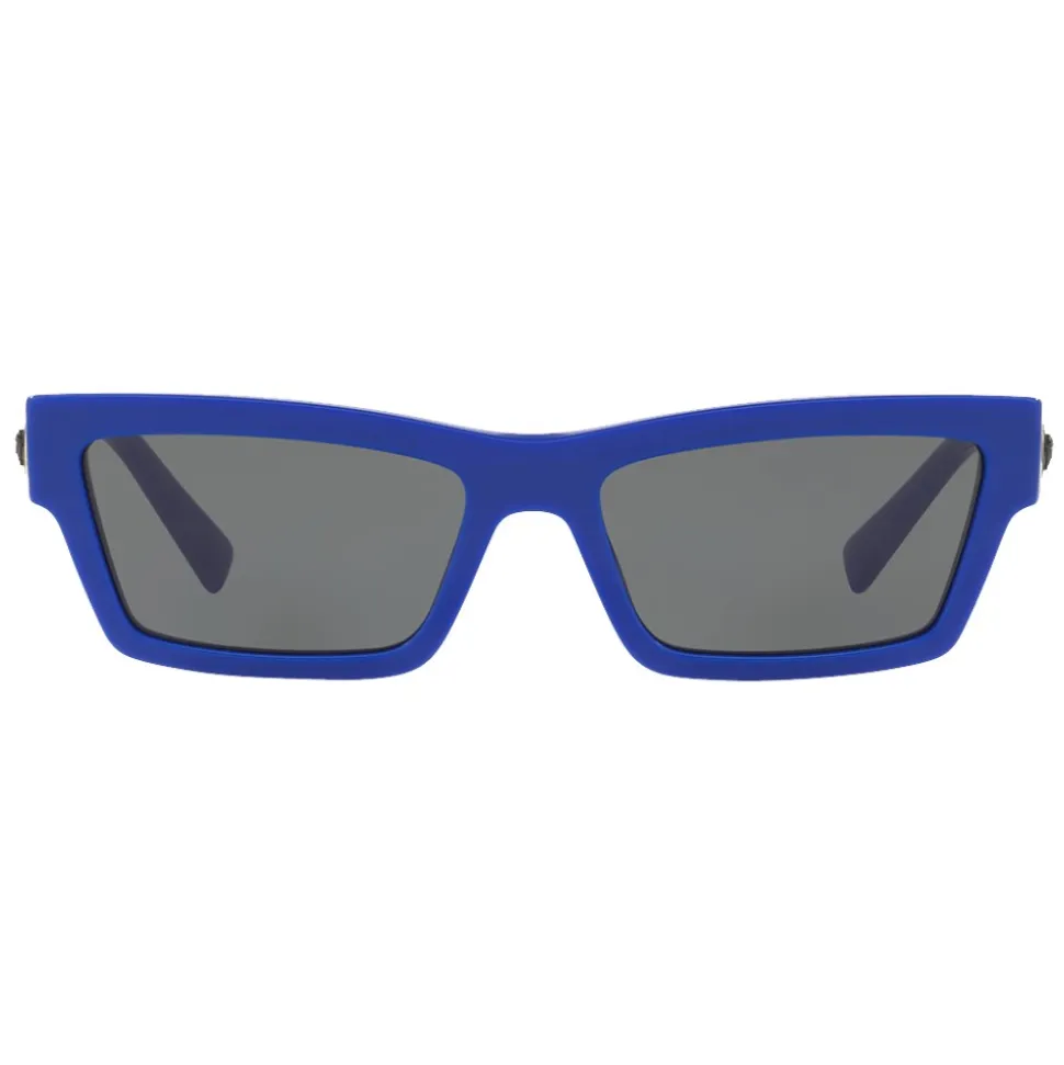 Sunglasses created to protect the look of the catwalk stars: a bold thin acetate frame and rectangular lenses. In an unexpected combination of blue and gray colors, with a three-dimensional Medusa Head and a Greek key engraving on the temples.