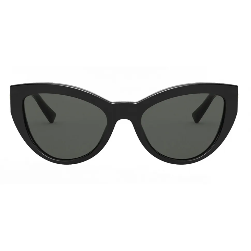 Black cat-eye sunglasses with a bold acetate frame and classic grey lenses. The temples are enriched with a Medusa encircled by crystals.