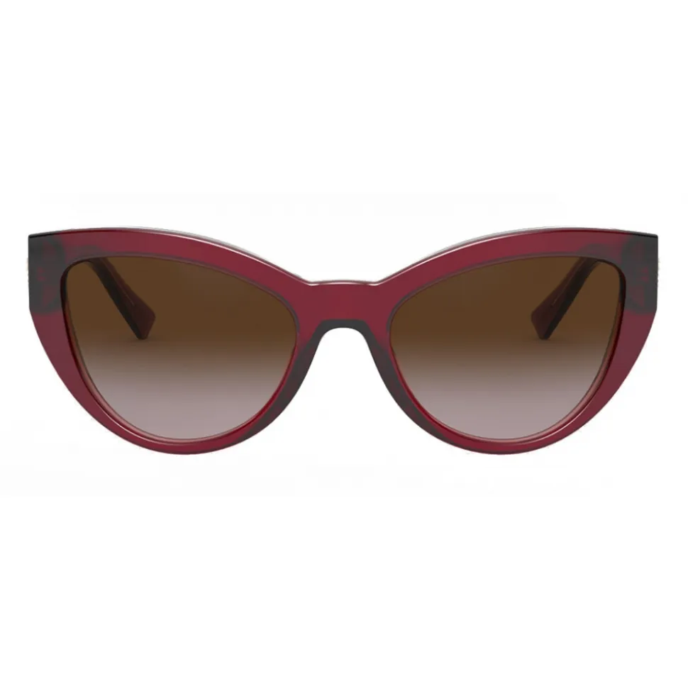 Burgundy cat-eye sunglasses with a bold acetate frame and brown lenses. The temples are enriched with a Medusa encircled by crystals.