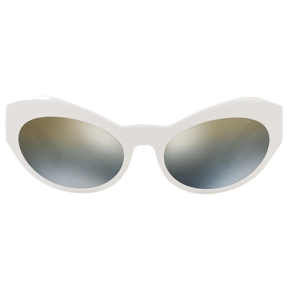 Without ever being afraid to stop and stare, the woman who wears these cat eye sunglasses in acetate always draws attention. With thick white frames, shaded mirrored lenses and temples decorated with light-gold Medusa studs in the shape of leaves.
