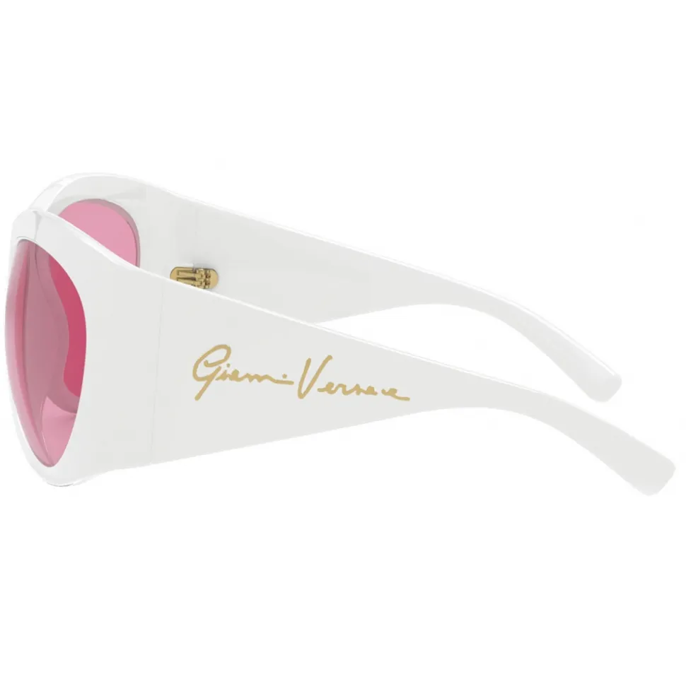 Playful, yet edgy, these round sunglasses add an avant-garde touch to any look. The bold style is characterized by a white frame embellished by Gianni Versace’s handwritten signature and pink lenses.