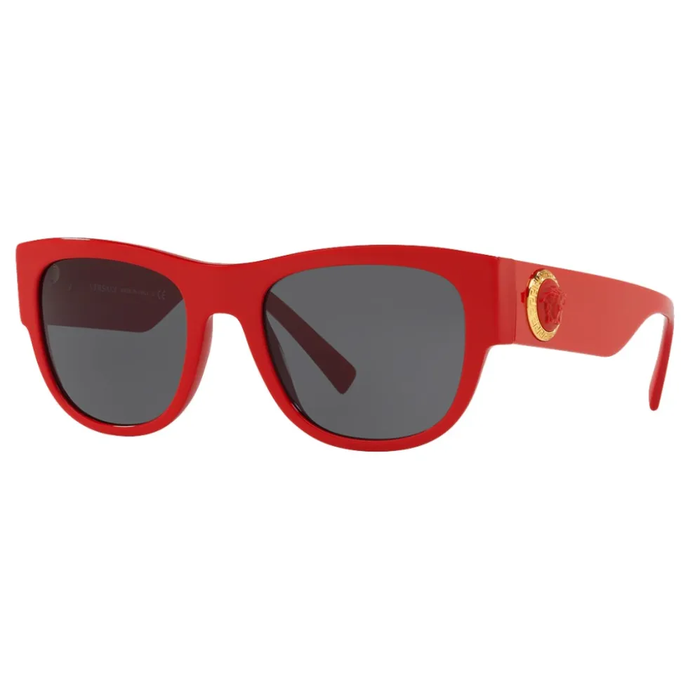 Sunglasses bold and gritty, which attract attention thanks to the combination of elegant design and bright colors. The red acetate temples are decorated with a three-dimensional Medusa-colored Medusa Head on a gilded medallion with a Greek key motif.