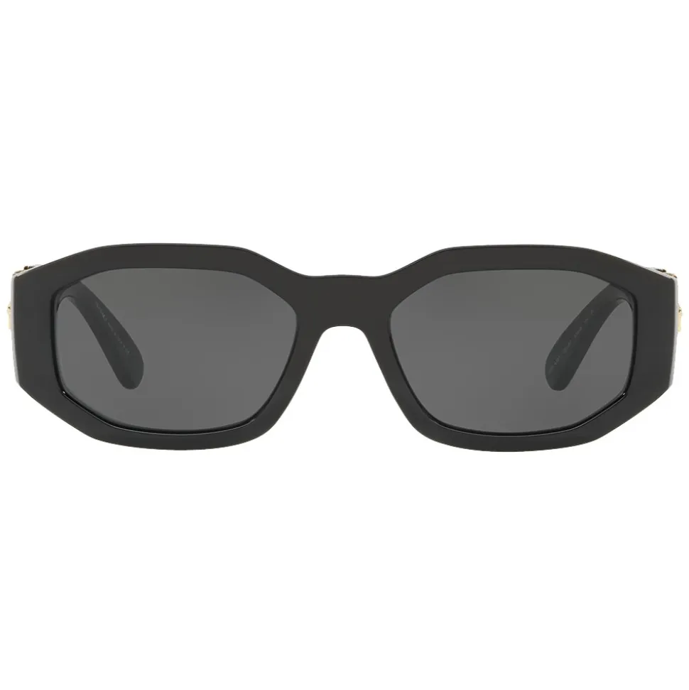 These sunglasses with wide temples and narrow lenses characterized by the bold shape, are decorated by the classic Medusa medallion, and recall the sumptuous style of the hip hop icon. In a classic combination of gray lenses on a thick black frame.