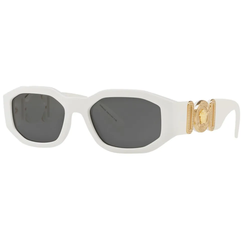 These sunglasses with wide temples and narrow lenses characterized by the bold shape, are decorated by the classic Medusa medallion, and recall the sumptuous style of the hip hop icon. In a cheeky combination of gray lenses on a thick white frame.