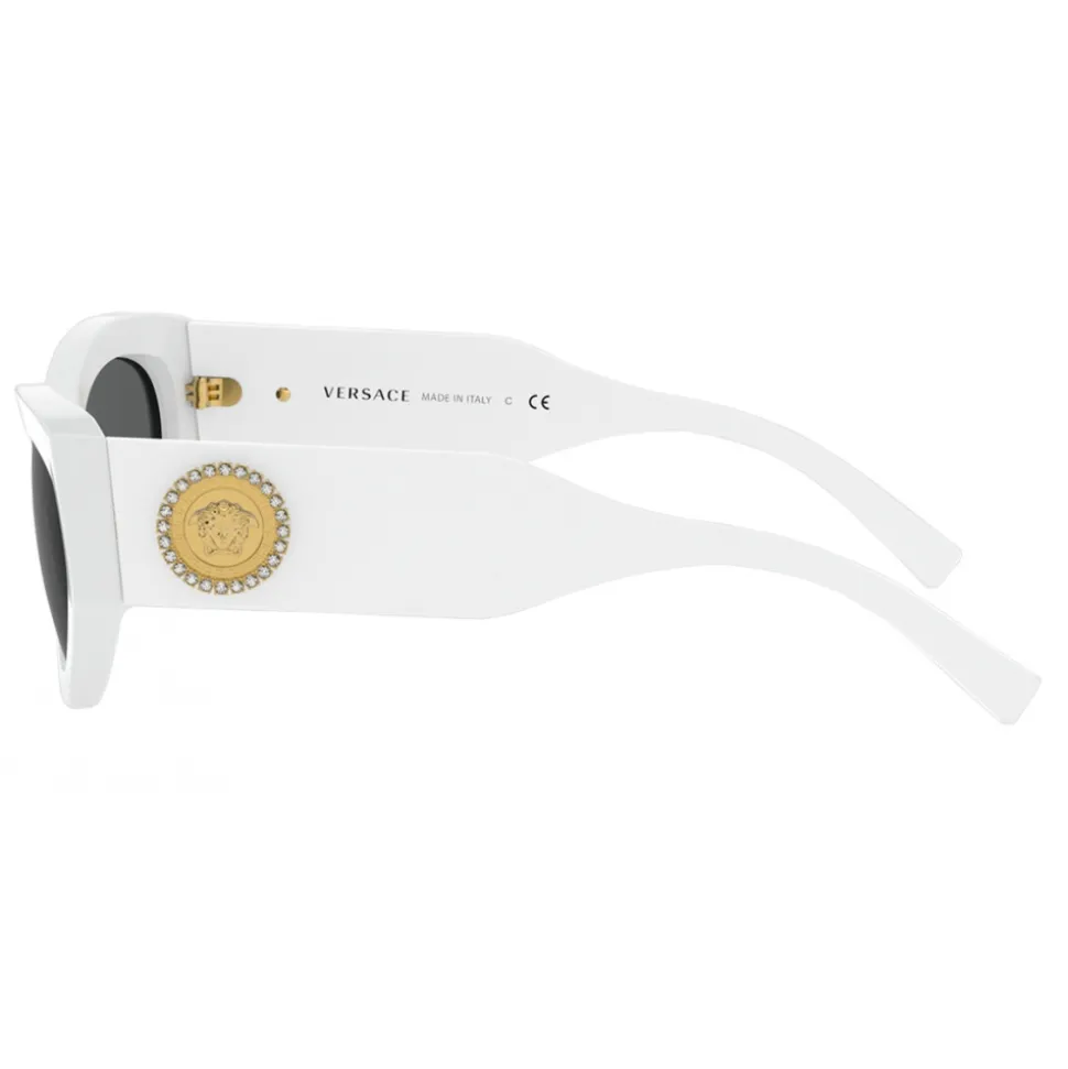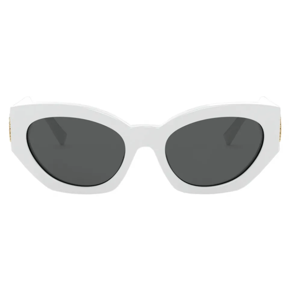 White sunglasses boasting a modern, thick acetate frame in an irregular shape. The temples are enriched with a Medusa encircled by crystals.