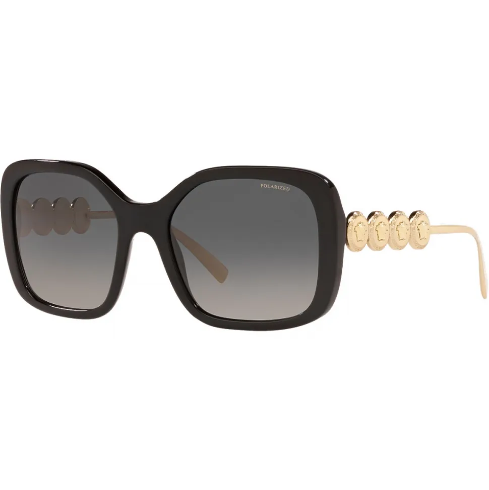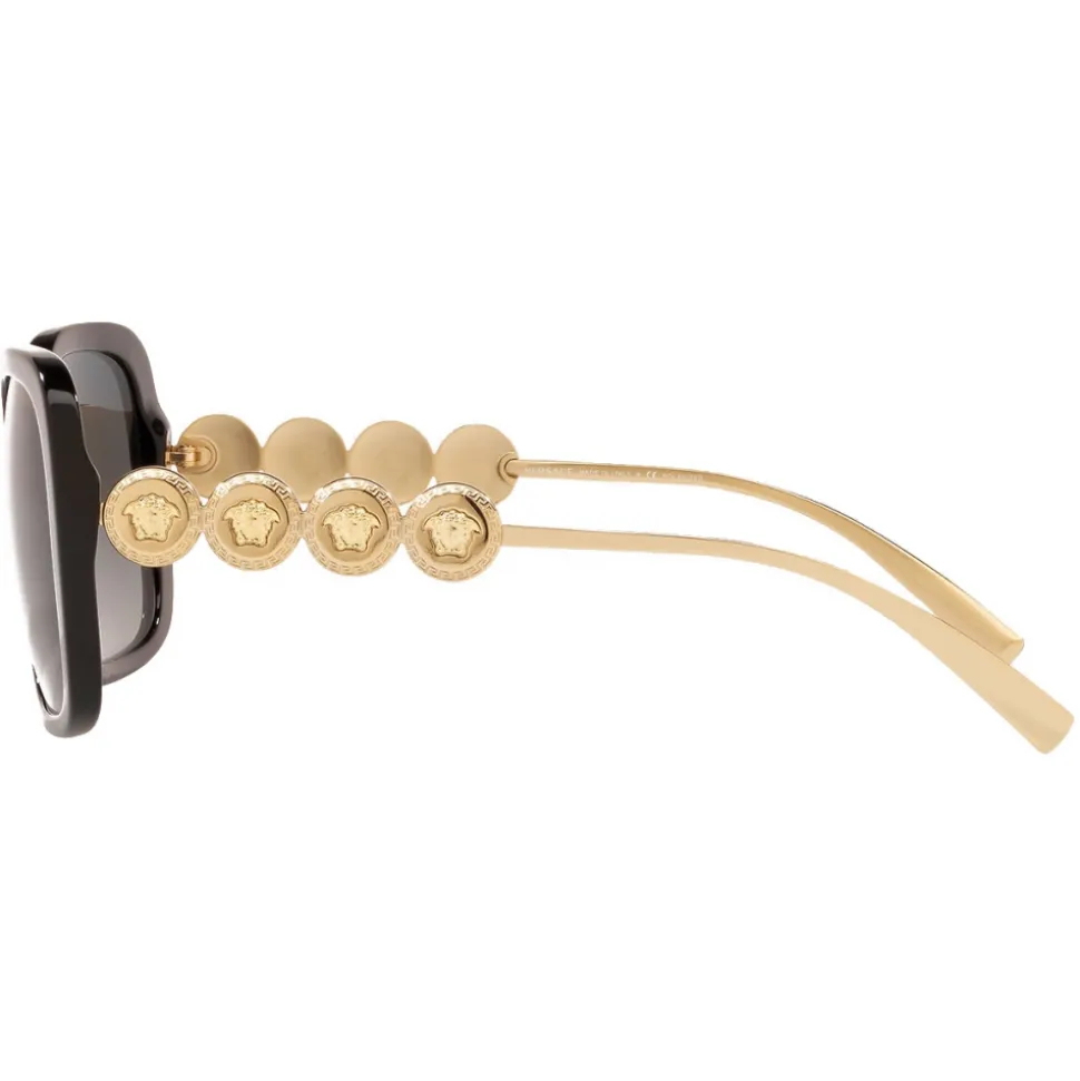Elegant, square-shaped sunglasses with a bold, black frame and polarized grey lenses. Enriched with four elegant Medusa medallions on the gold-tone temples.