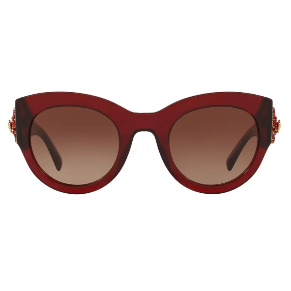 These Tribute sunglasses are updated with a new temple accent: characterized by a small Medusa icon surrounded by crystal petals. The sunglasses feature a transparent burgundy frame and lenses.