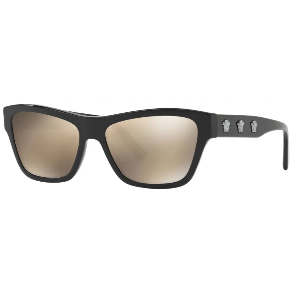 Cat-eyed sunglasses with black frames, mirrored gold-brown lenses, jet-black hematite details and three lateral Medusa heads.