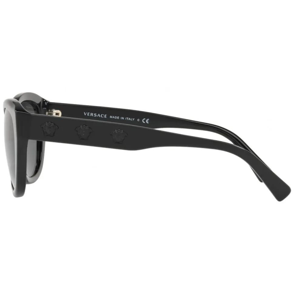 Cat-eyed sunglasses with black frame, gray lenses, jet black details and three lateral Medusa heads.