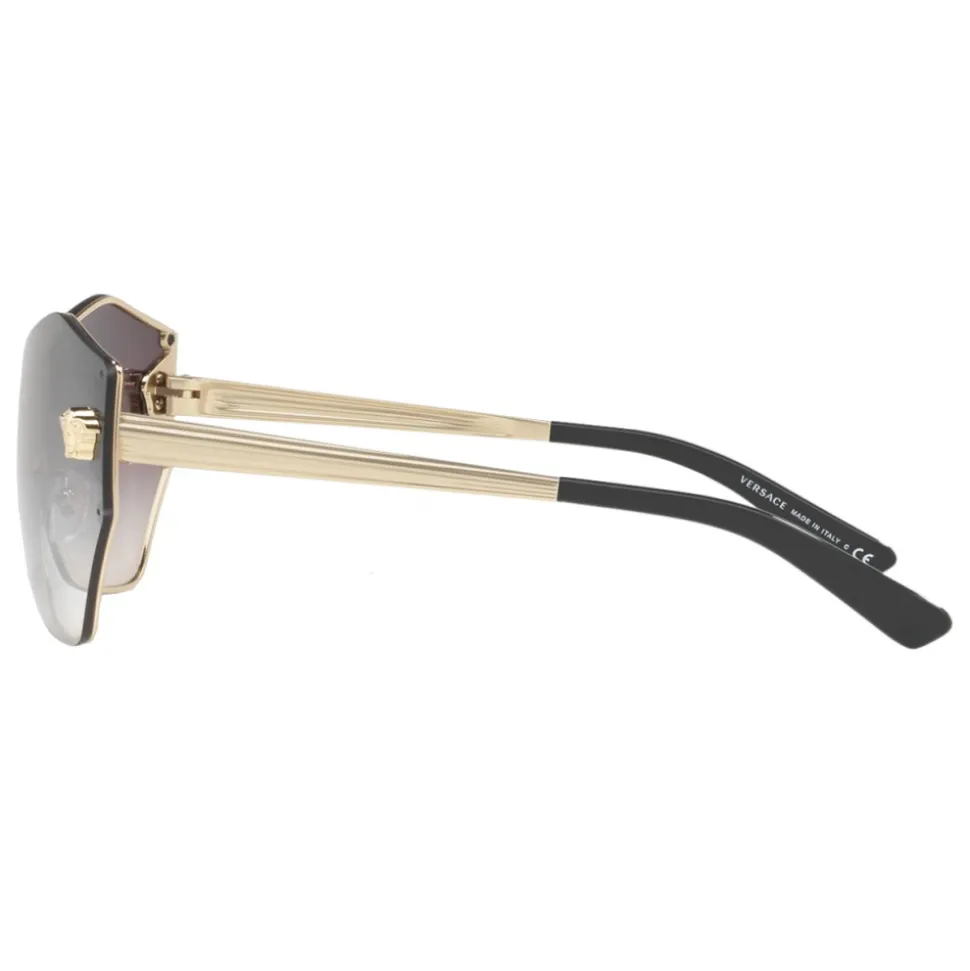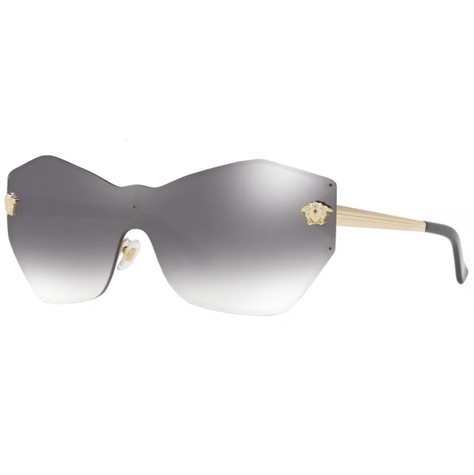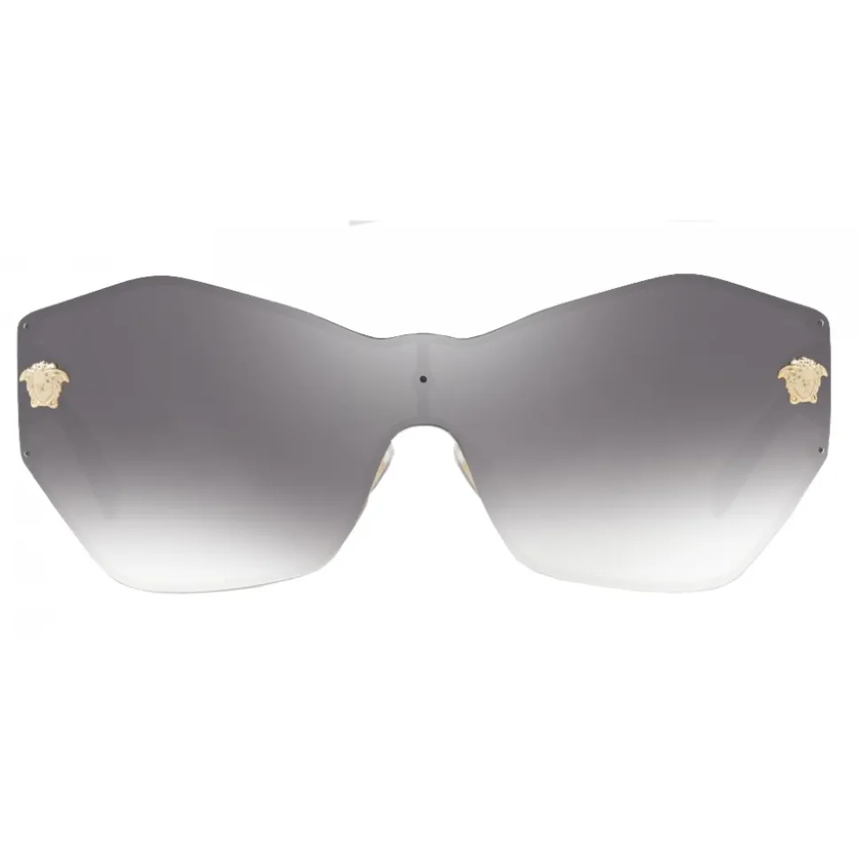 Elegant and futuristic sunglasses with a shield lens shape in a chic, mirrored grey tone. Enriched with two pale gold tone Medusa studs.