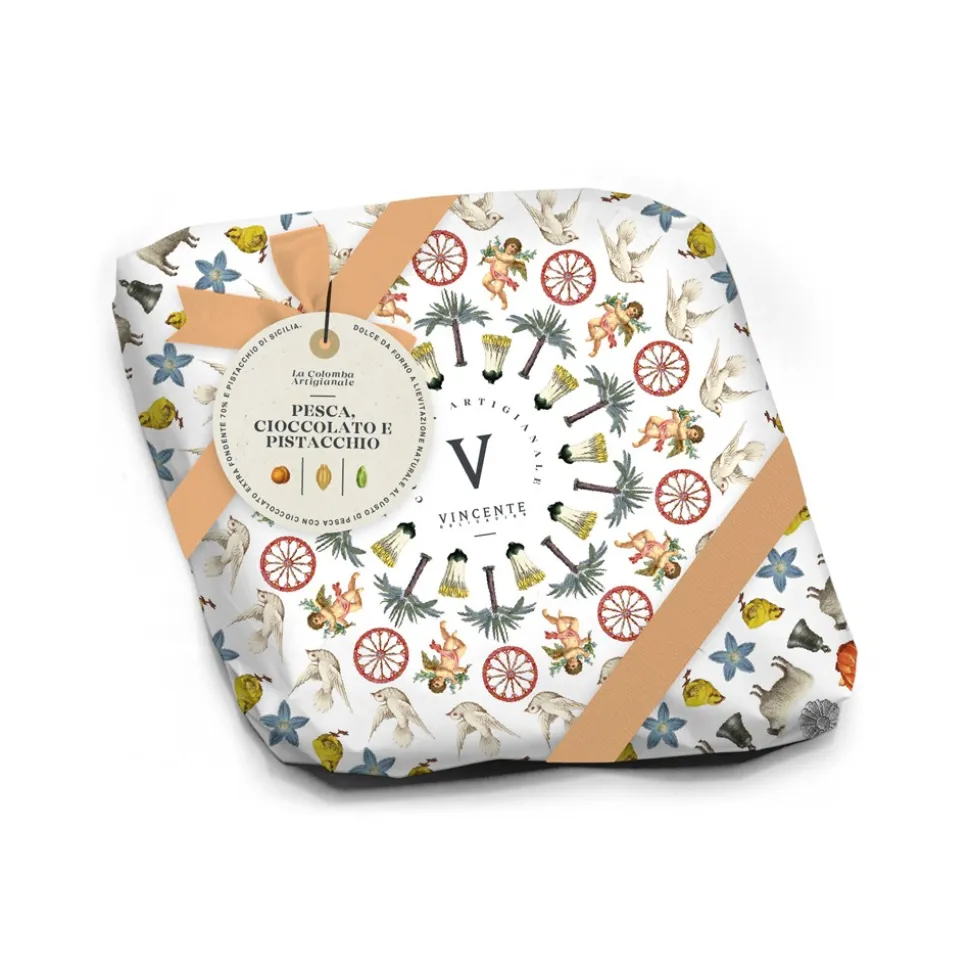 Persica – Artisan Easter Dove – Peach, 70% Extra Dark Chocolate, Sicilian Pistachio – Fastuca Line – Hand Wrapped Artisan Easter Dove