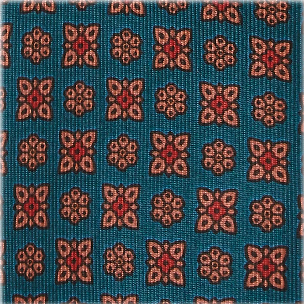 Ancient madder ties are always printed on a twill silk fabric treated with ‘gum arabic.’ The madder dyes combined with the gum silk create a characteristic handfeel that is uniquely soft and chalky.