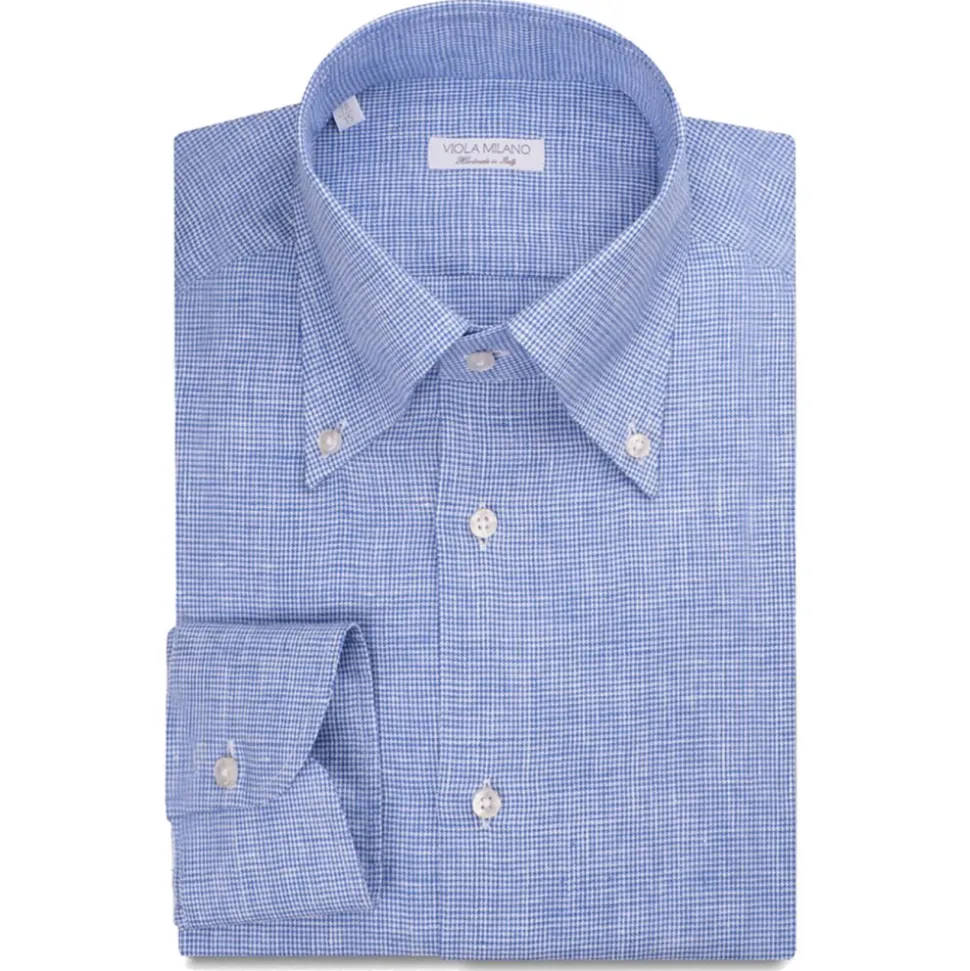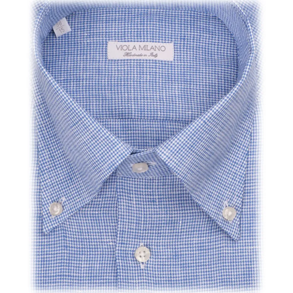 Viola Milano – Micro Pattern 100% Linen Button-Down Collar Shirt – Light Blue – Handmade in Italy – Luxury Exclusive Collection