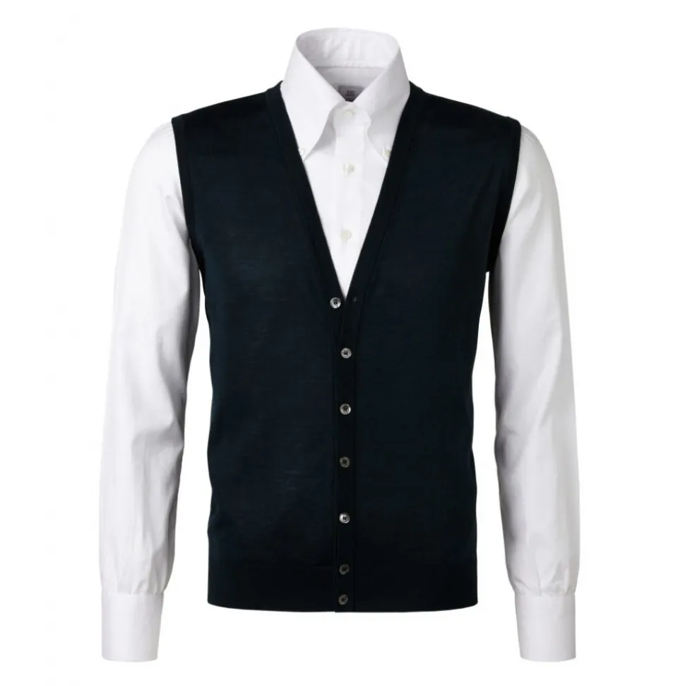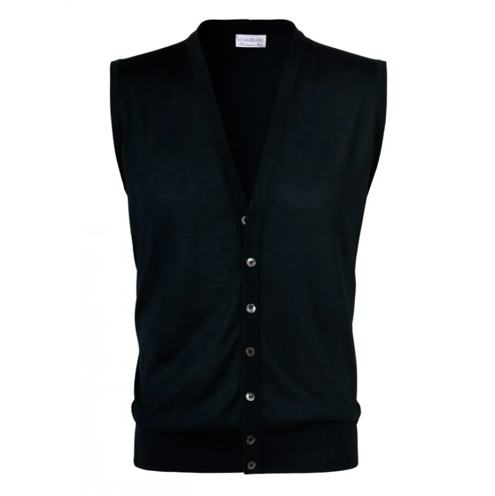 Luxury Sleeveless feather weight cashmere/silk cardigan. Finish by hand in our own small workshop outside Milano, Italy.