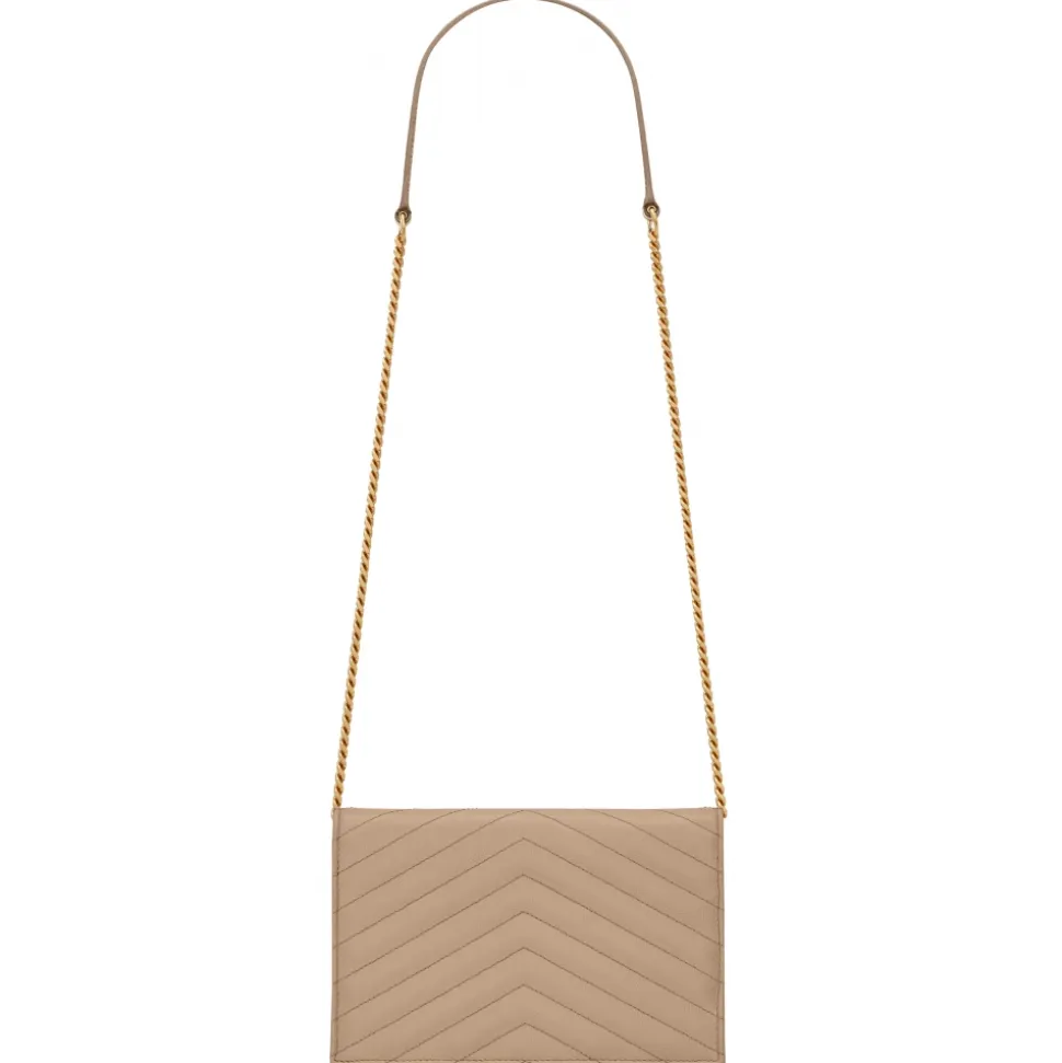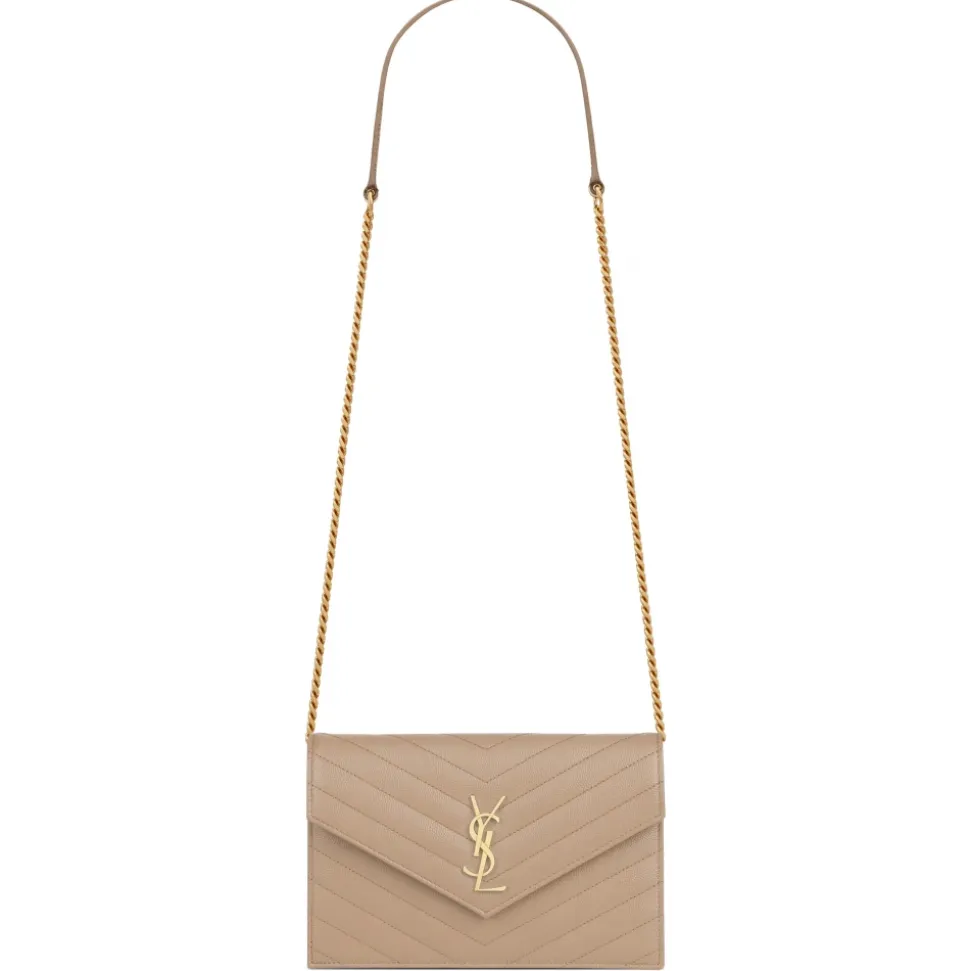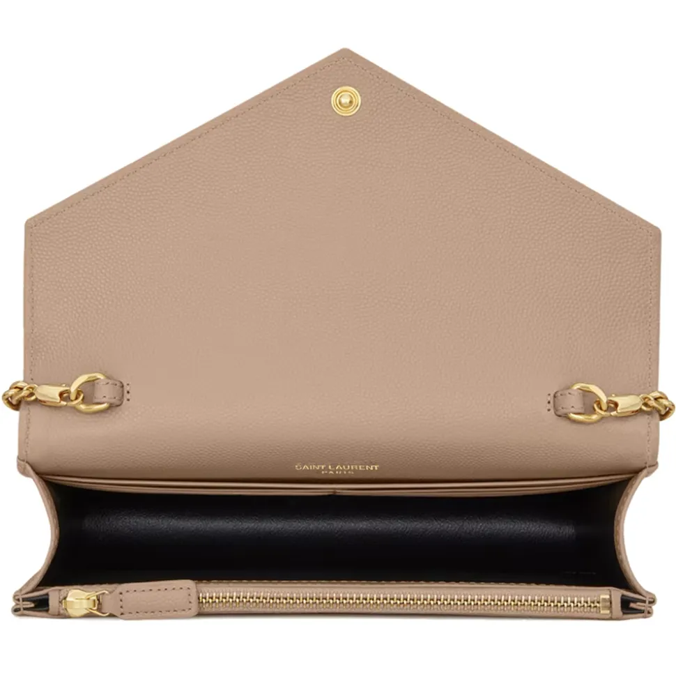 Yves Saint Laurent – Cassandre Envelope Chain Wallet in Grain De Poudre Leather – Dark Beige – Saint Laurent Exclusive Collection