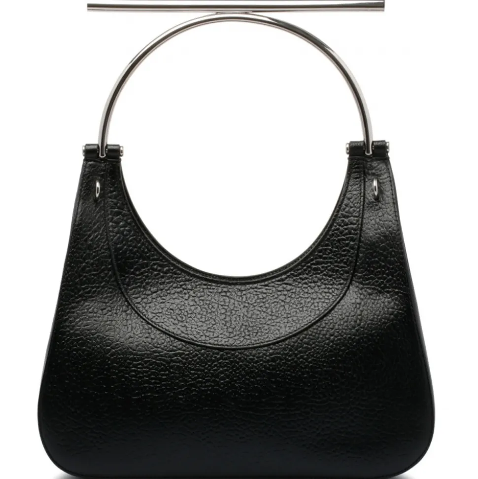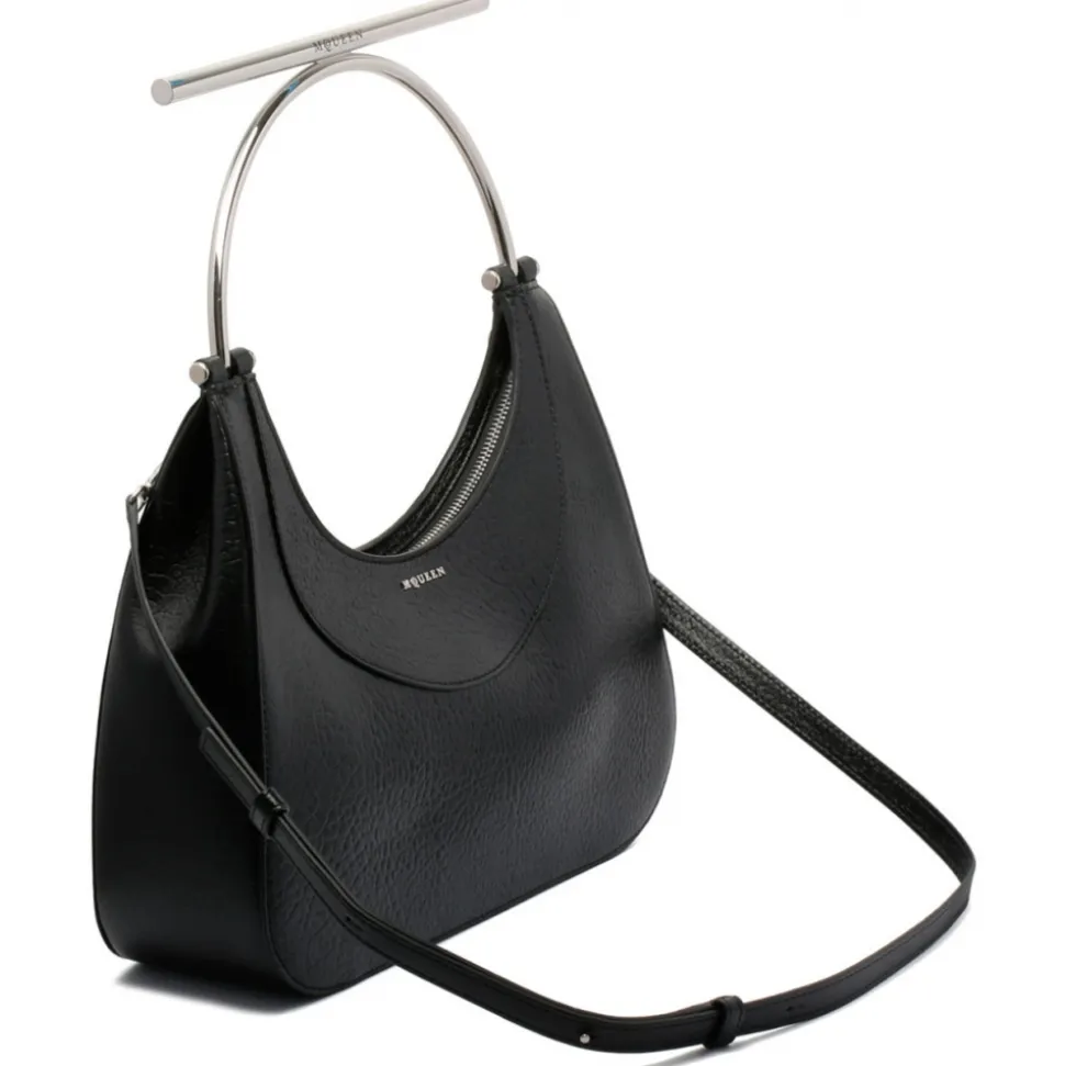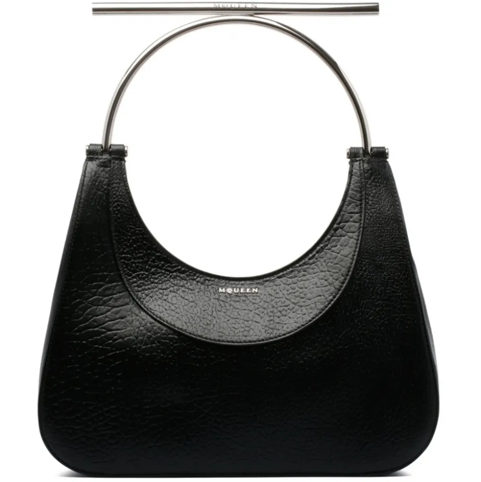 Alexander McQueen Black Full Grain Lambskin Cross-Bar Bag with soft, structured body and side pleats. Large round handle in iridescent metal with horizontal Cross-Bar in shiny silver with engraved McQueen logo. The model can be carried by hand, on the shoulder or cross-body thanks to the removable leather shoulder strap and by folding the metal handle.