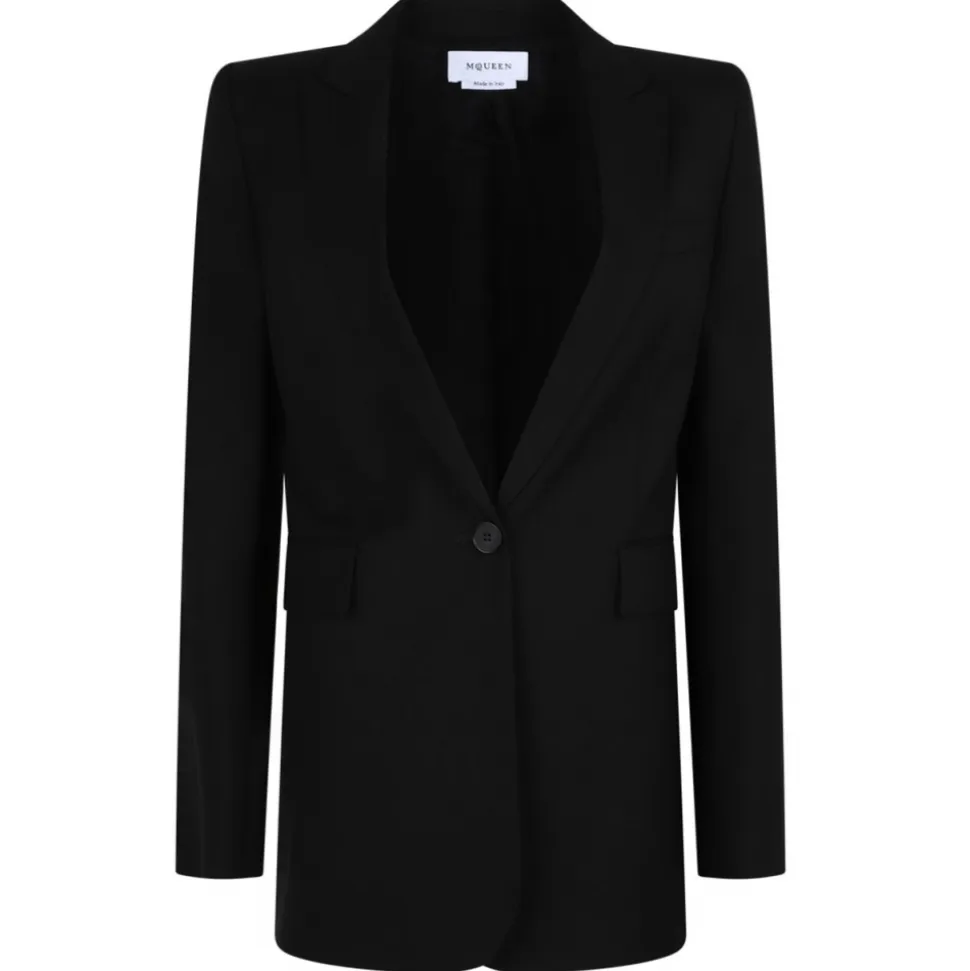 Alexander McQueen Black Voluminous Shoulders Blazer. Black single-breasted blazer in wool gabardine with peaked lapels and voluminous shoulders. Single button fastening. Two side flap pockets, over fit. Chain with cross-bar fastening on the back.