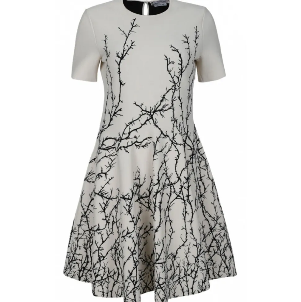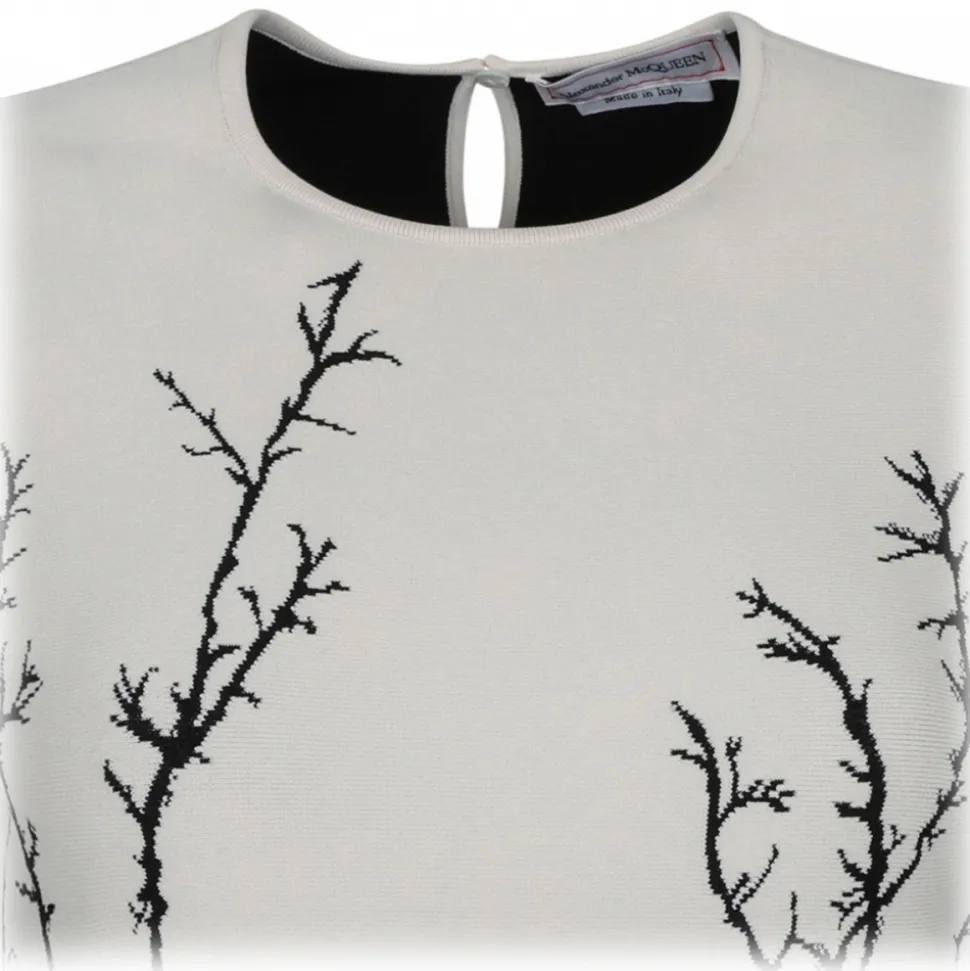 Alexander Mcqueen Ivory and Black Mini Dress. Ivory and black stretch viscose knit minidress with jacquard thorn branch motif. Crew neck and flared skirt. Teardrop closure on the back.