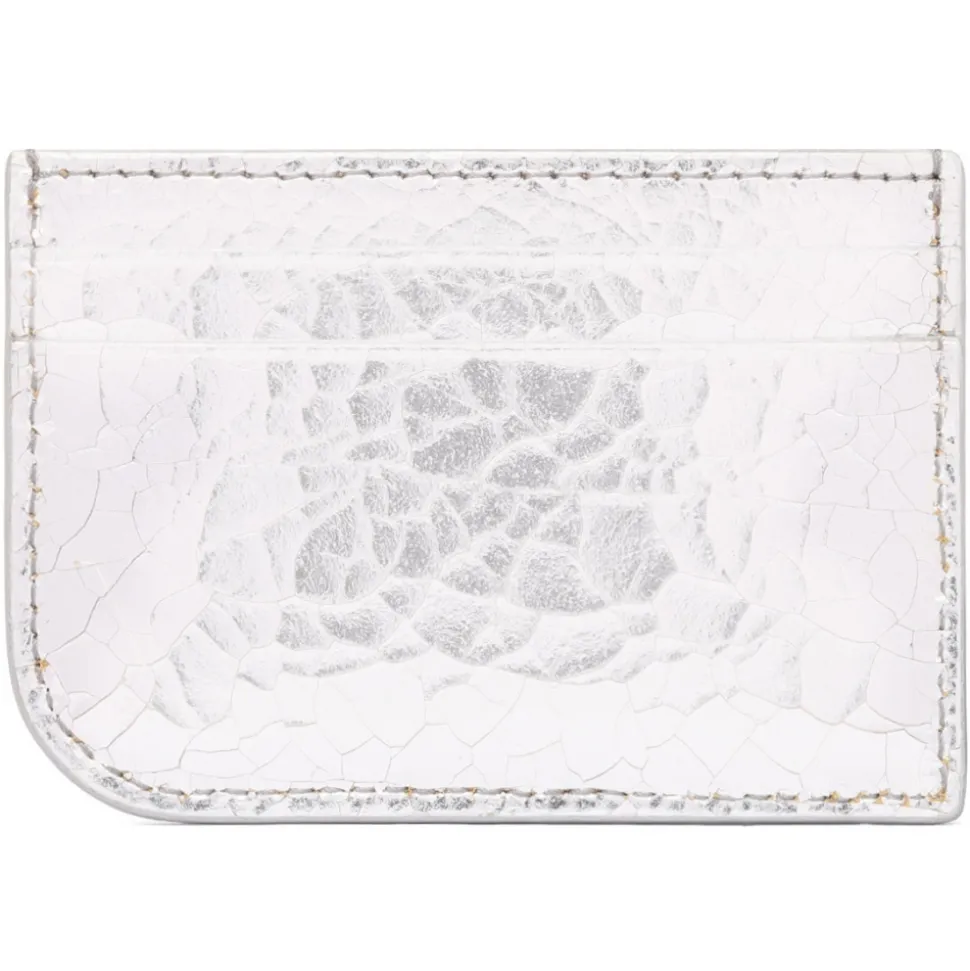 Alexander McQueen Silver Sling Card Holder. Silver sling card holder, asymmetrical model made of beige suede calfskin. Metallic silver crackle coating. Features a central compartment and four card slots.