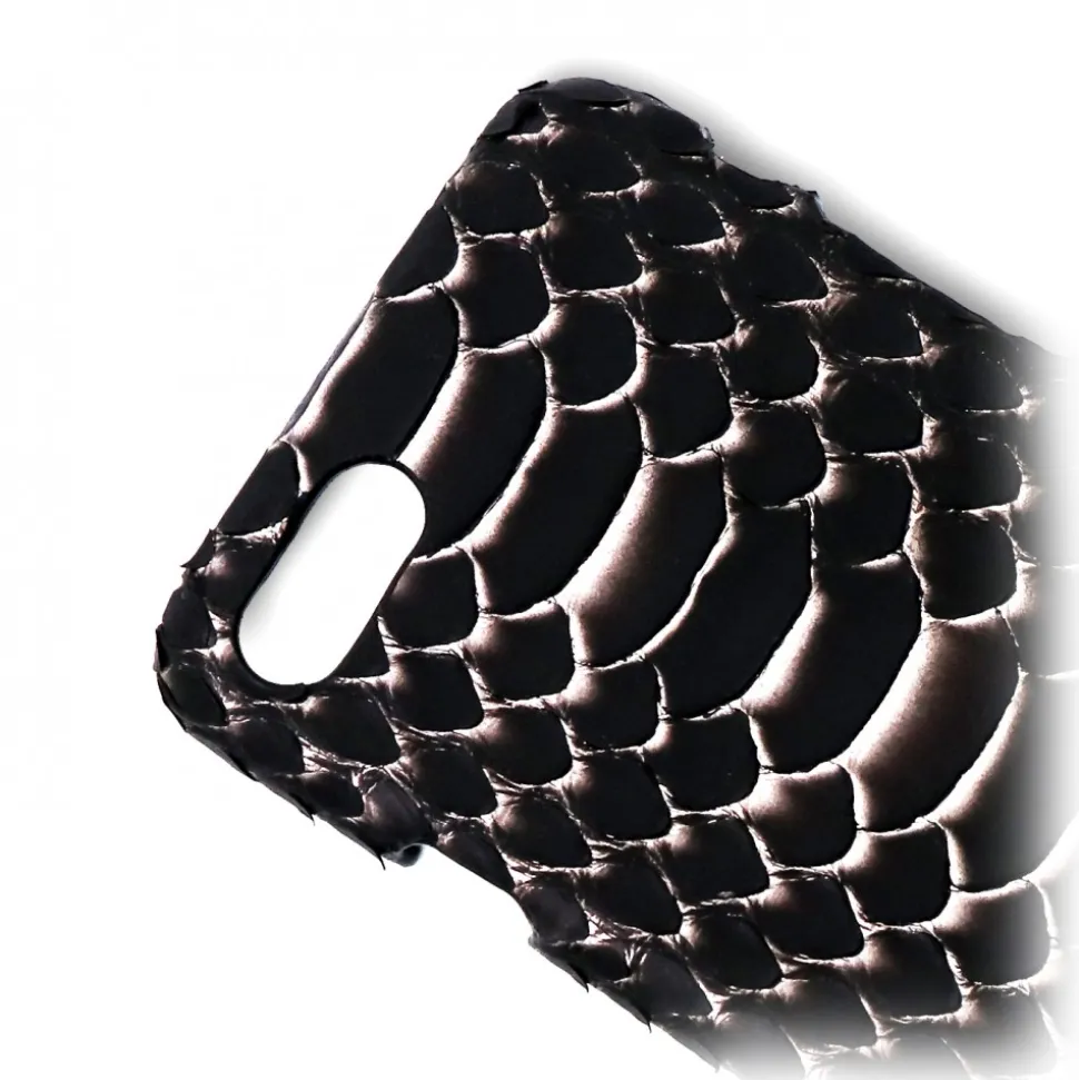 Handmade iPhone cover in python leather made in Italy. The python skin is beautifully tinted in shades of metallic rose gold at the rim of the python scales.