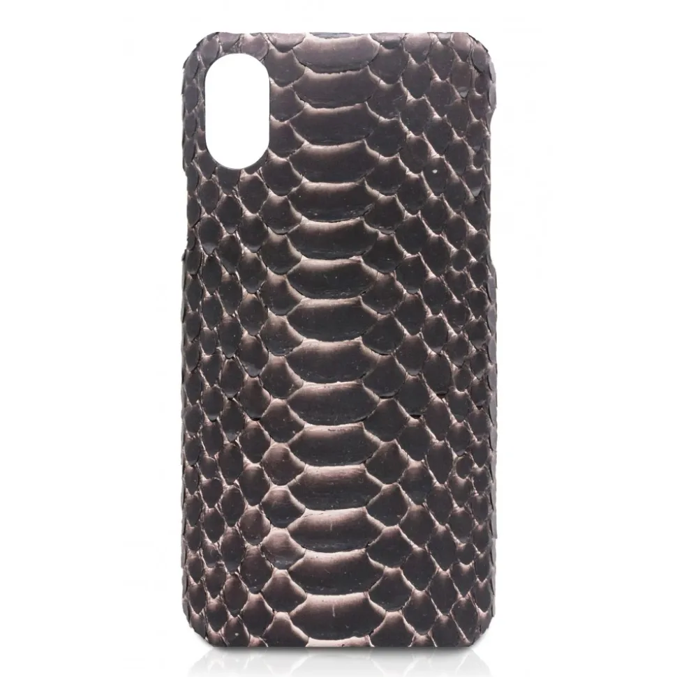 Handmade iPhone cover in python leather made in Italy. The python skin is beautifully tinted in shades of metallic rose gold at the rim of the python scales.