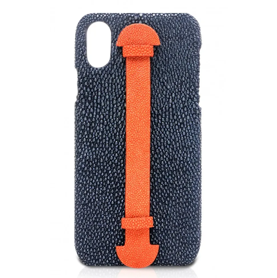 Handmade iPhone cover in stingray leather made in Italy. It has a finger holder that allows you to use your phone with one hand only without dropping it.