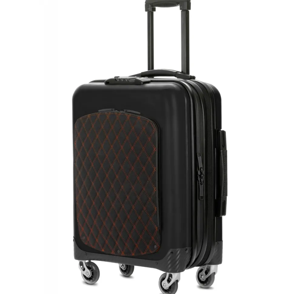 Avvenice Aura Trolley in aluminium, carbon fiber, alcantara and cave leather. Featuring a surprisingly spacious flat interior compartment, the four-wheeled model represents the future of luxury carry-on luggage. The accessory combines innovation and lightness in every detail, from the new TSA locking system to the most comfortable and silent wheels ever designed.