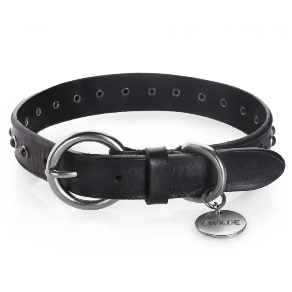 Genuine leather decorated with black cabochons. B.WILDE name tag. Personalised on request. Silver or antique gold hardware.