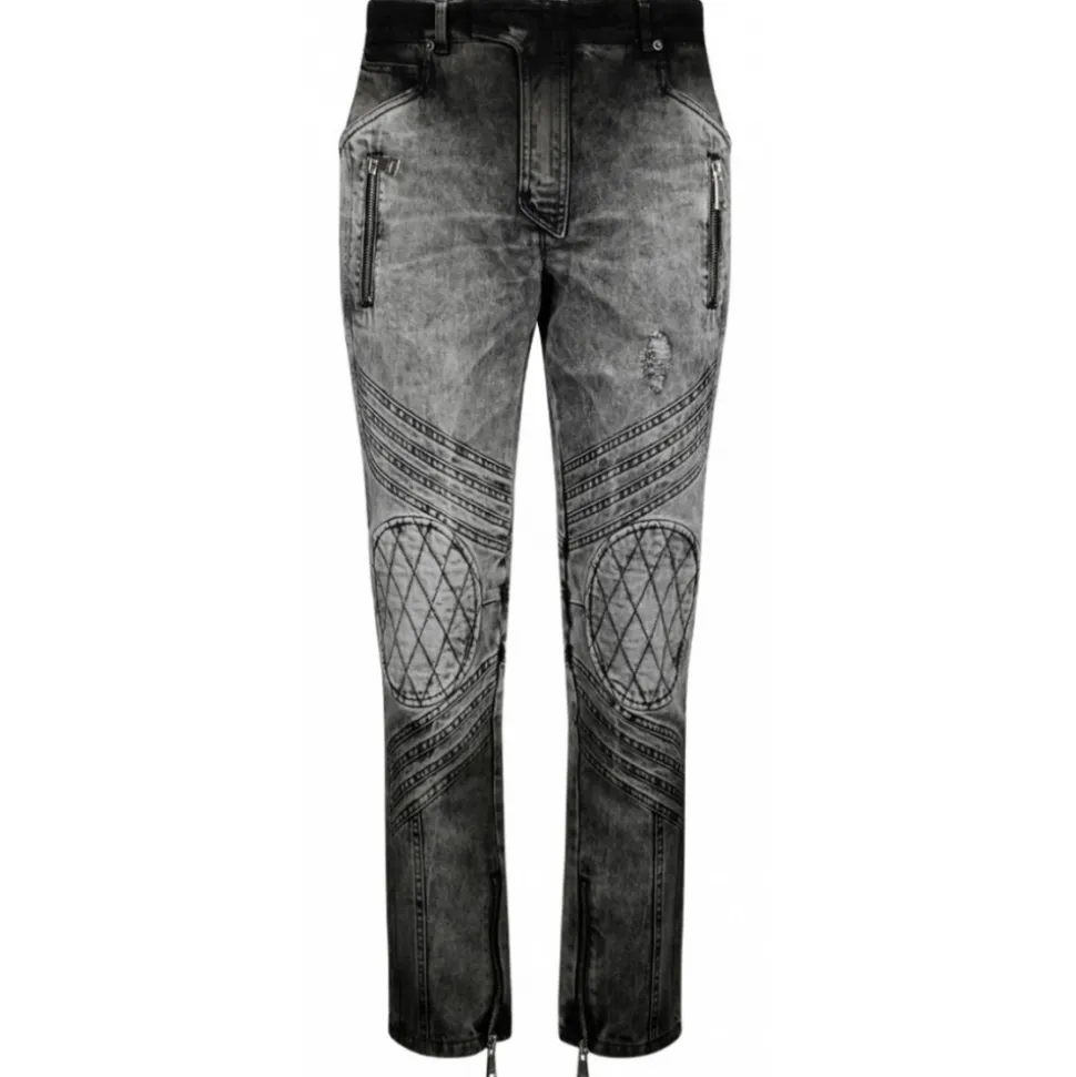 Balmain Dark Grey Biker Jeans. Dark grey faded denim jeans, cut out details and quilted knees. Five classic pockets, two patch pockets at the back, Western cut out front fastening. Zip and concealed press stud, silver metal details, triple loop belt, Balmain signature logo embroidered at the back.