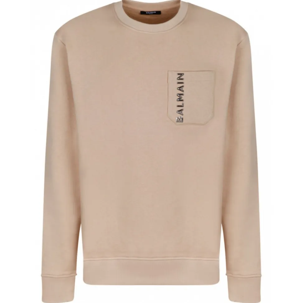 Balmain Beige Embossed Logo Sweatshirt. Beige cotton sweatshirt, round collar, long sleeves, elastic cuffs, embossed Balmain logo, chest pocket and straight elastic hem.