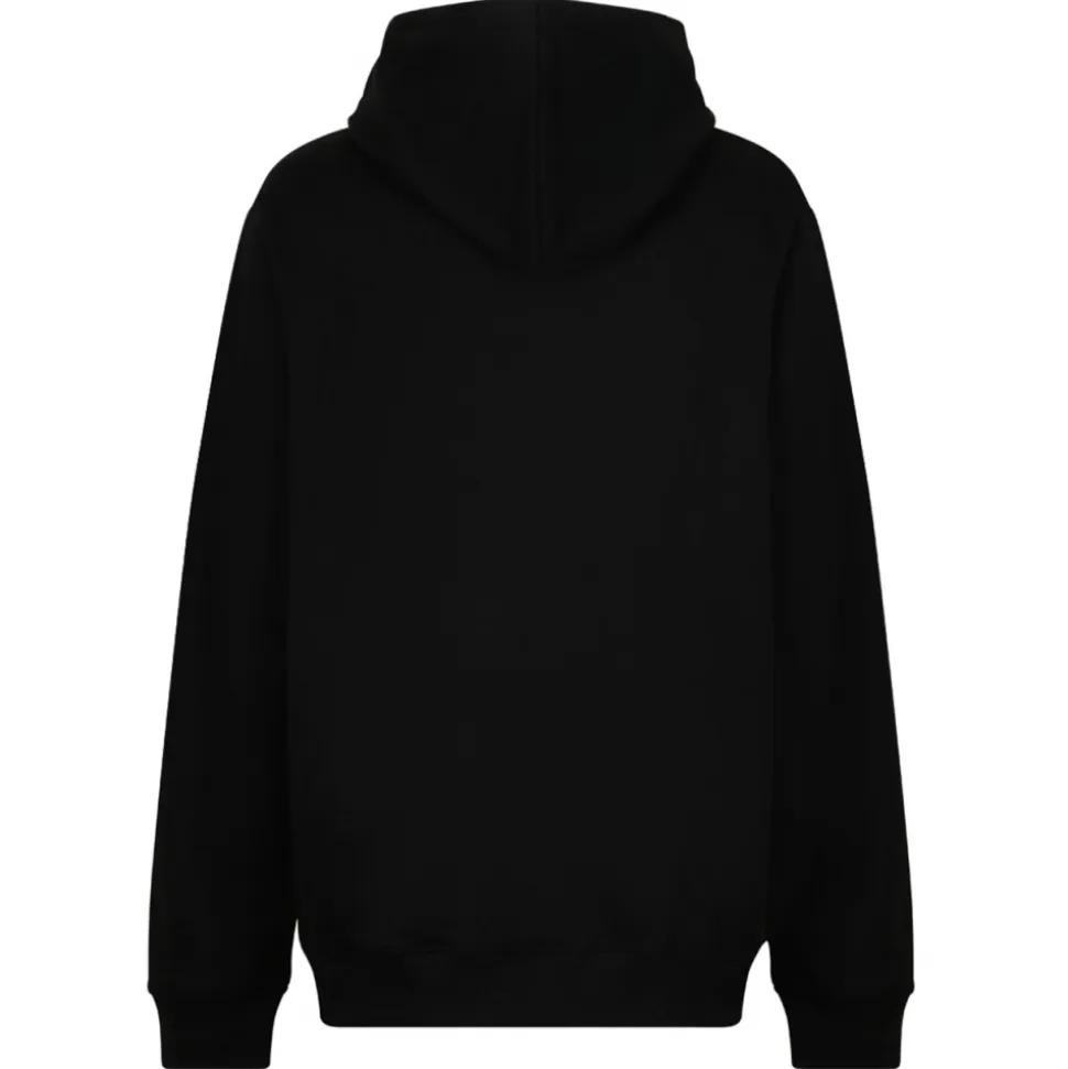 Balmain Black Flocked Logo Hoodie. Black cotton hoodie, jersey texture, flocked logo, drawstring hood. Long sleeves, ribbed cuffs and hem, front pouch pocket.