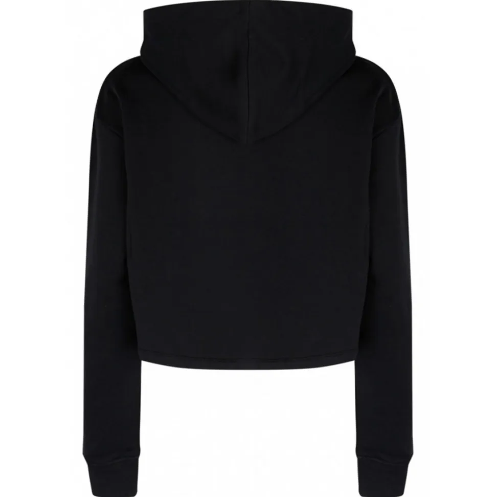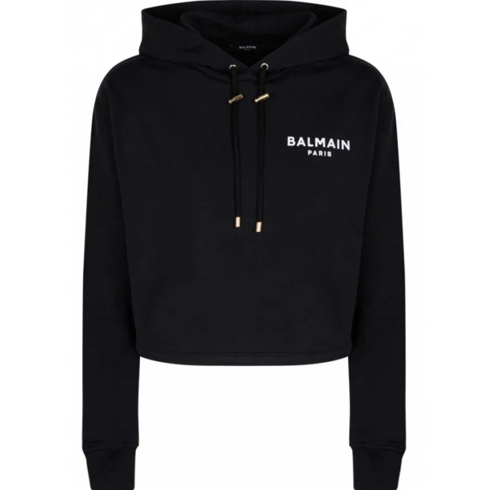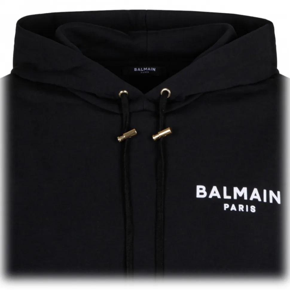 Balmain Black Logo Print Hoodie. Black cotton hoodie, contrasting flocked Balmain Paris logo on the front, round neck, long sleeves, drawstring adjustable hood. Golden metal ends, stoppers and eyelets, ribbed trim.