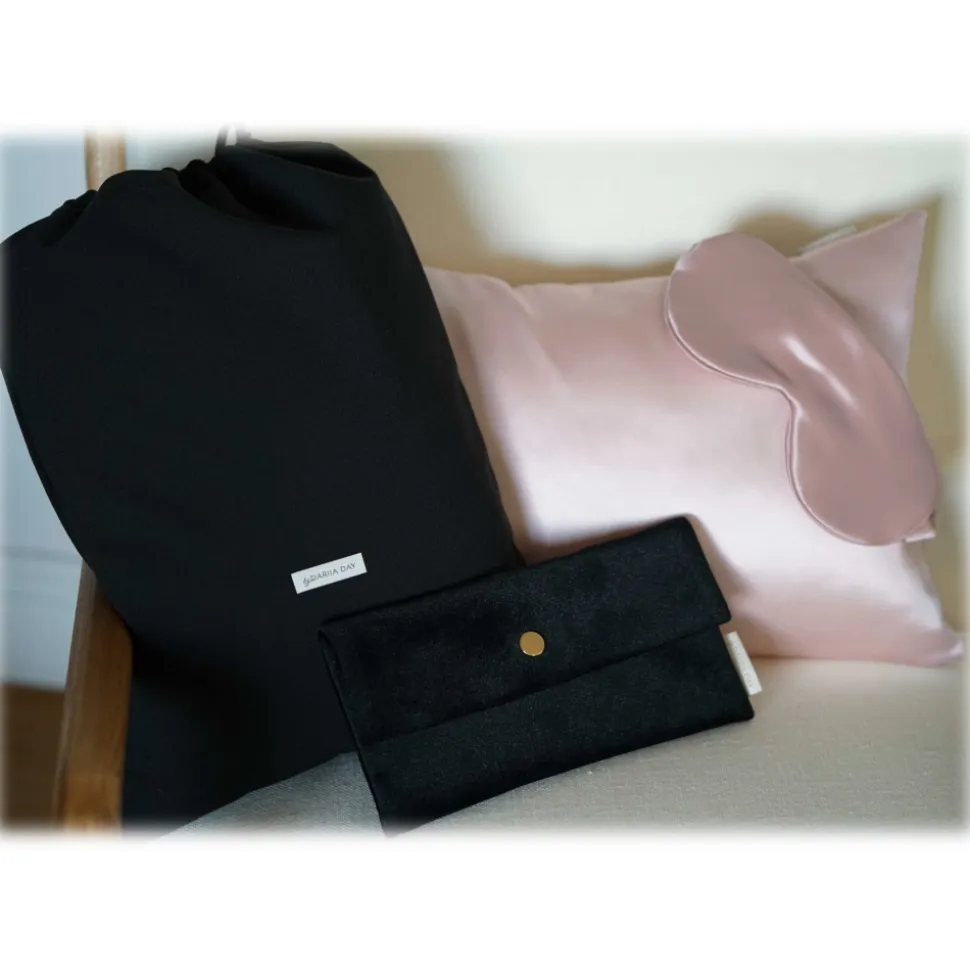 Each travel set comes with an elegant and practical black travel bag and a matching black pouch for the eye mask. That way you always have a practical, well-protected and luxurious set for travel. The ultimate luxury travel companion.