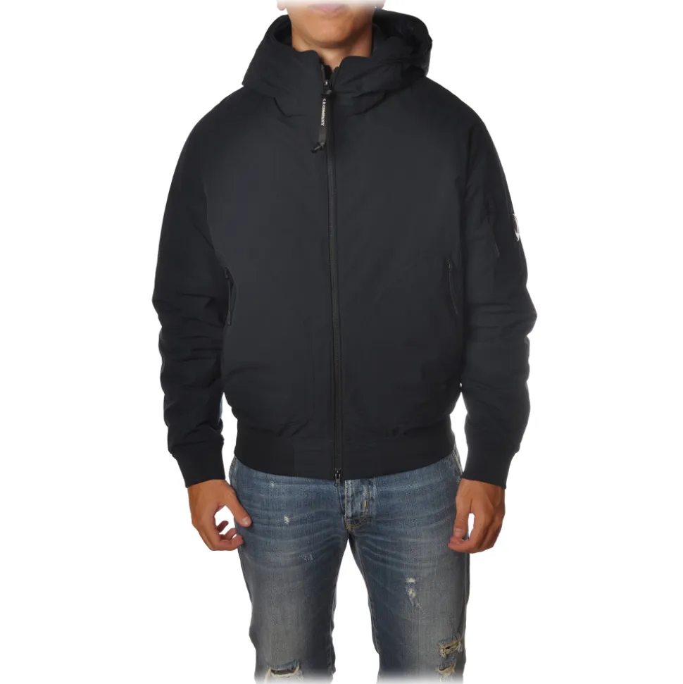Hooded down jacket, with double front pocket with zip and central front closure with zip, and with C.P logo on left sleeve.