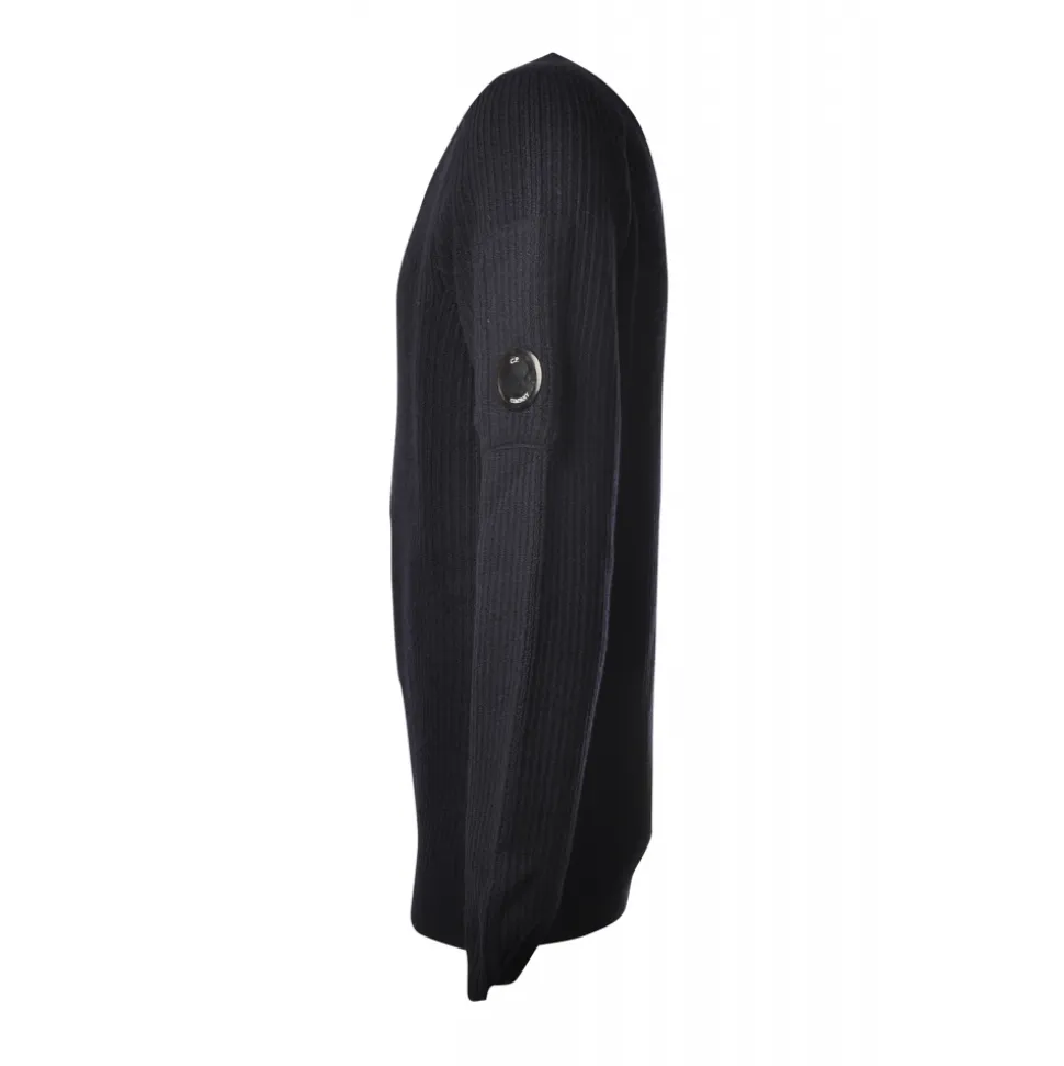 Long-sleeved crewneck sweater, with reverse shoulder, plus bubble logo with pocket and zip on left sleeve, all made in Lambswool, C.P. Company.