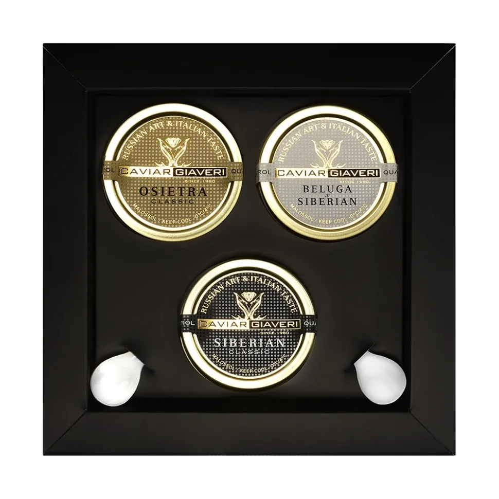 The best way to become acquainted with the flavours enclosed in all varieties of Caviar Giaveri: for you and your guests we have created the exclusive Zar Trilogy Luxury Box, containing samples of 3 caviar cru. Perfect for a refined date or elegant party, it is a pleasant tasting opportunity to explore the different perceptions that each type of caviar arouse. A charming gift for true connoisseurs.