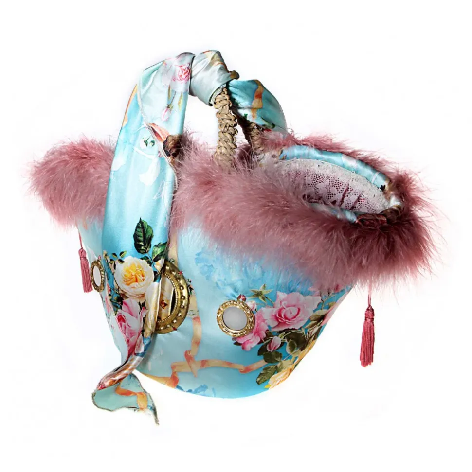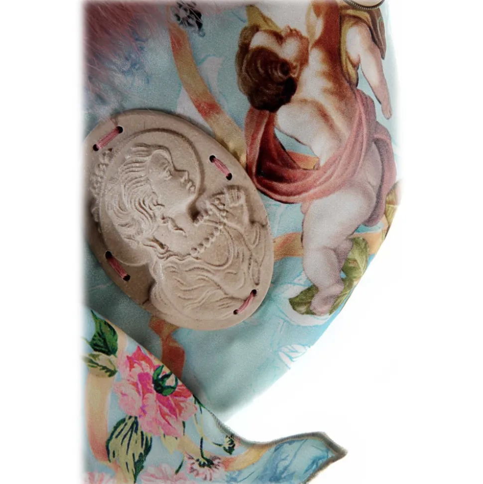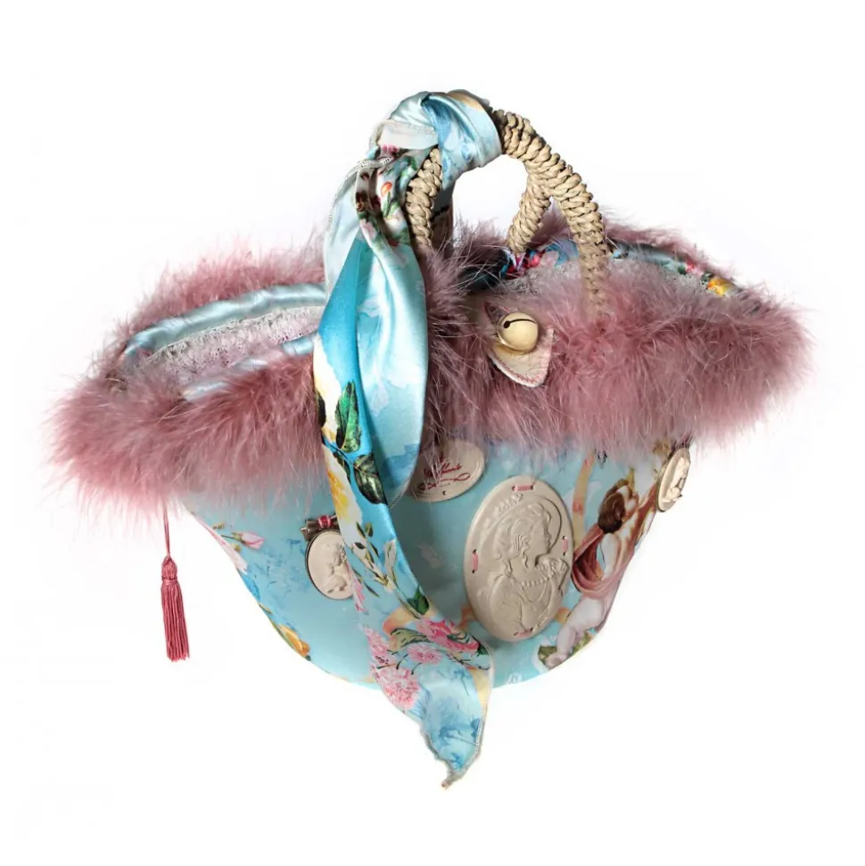 Baby crow’s nest in pure silk lining patterned with lateral pendants angels, angels engraved on stone and central insert depicting Sicilian twentieth century woman of eco pink fur coat and scarf for locking handles with pendant brand coffarte stone, leather bottom and feet.